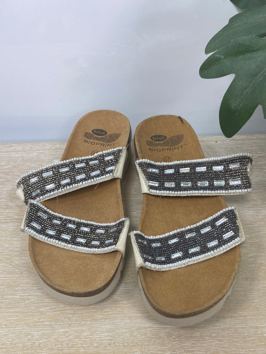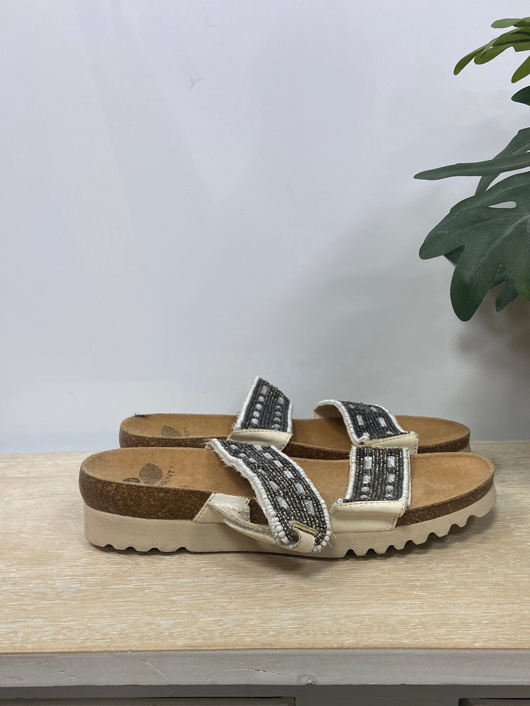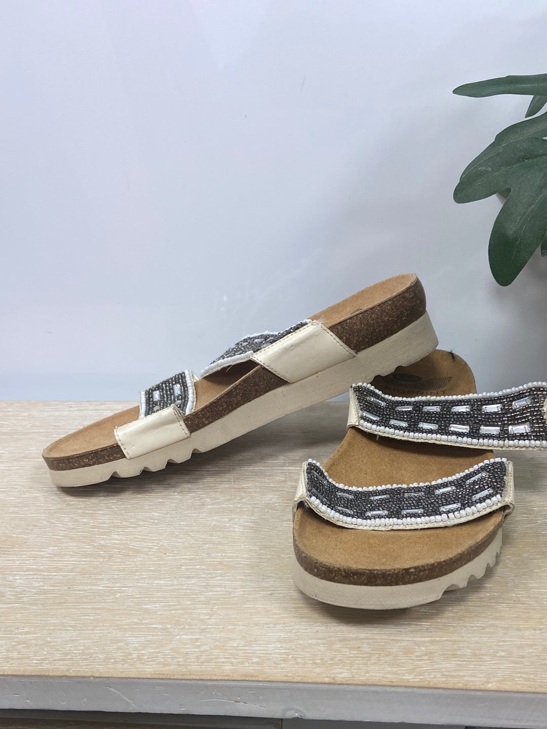 Sandalias blancas con abalorios en tono plateado se ajustan con velcro. Suela de goma y corcho. Tacón 4 cm