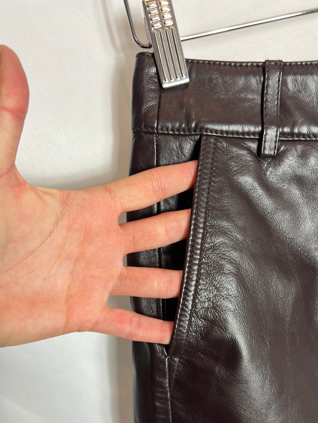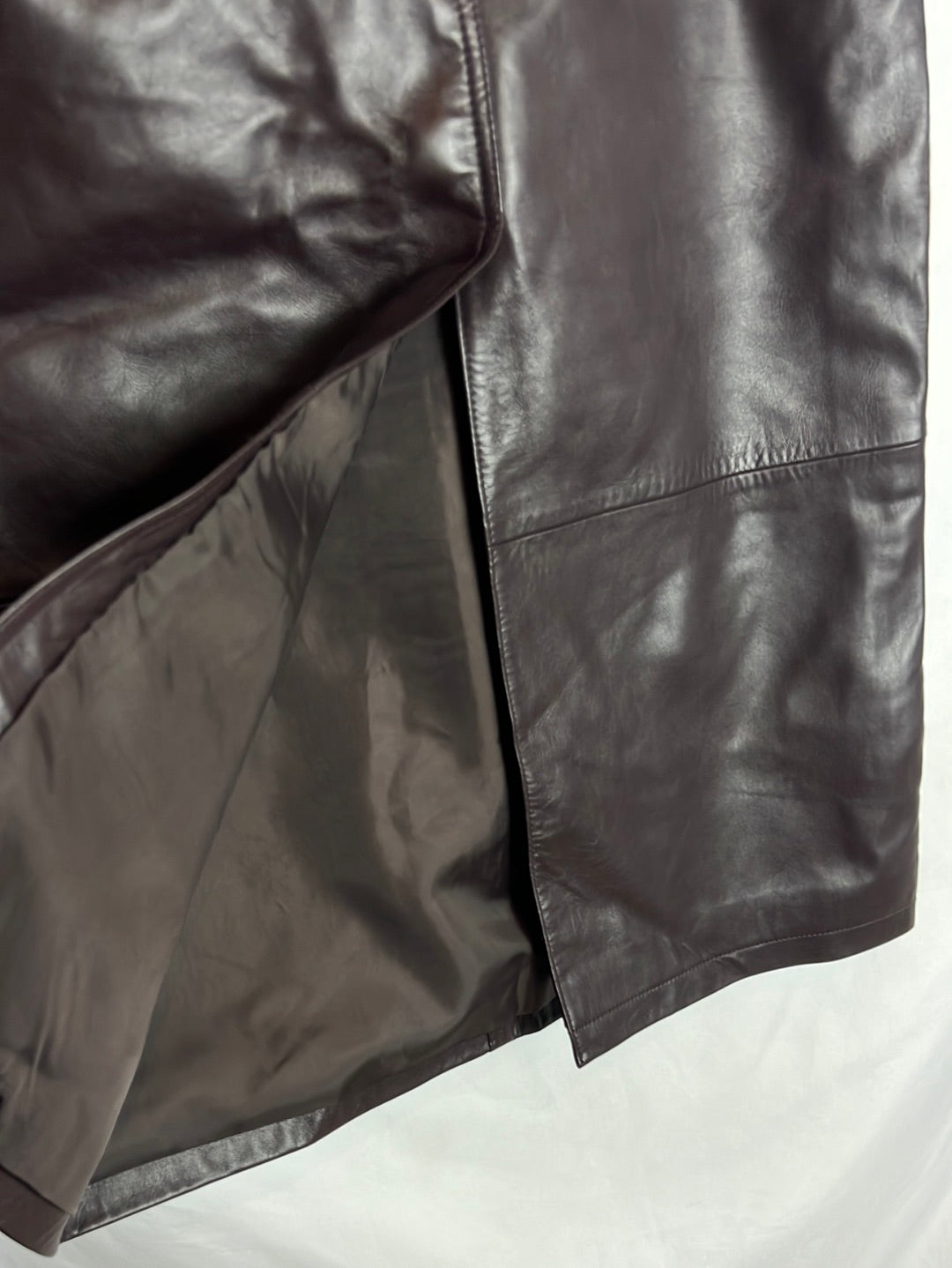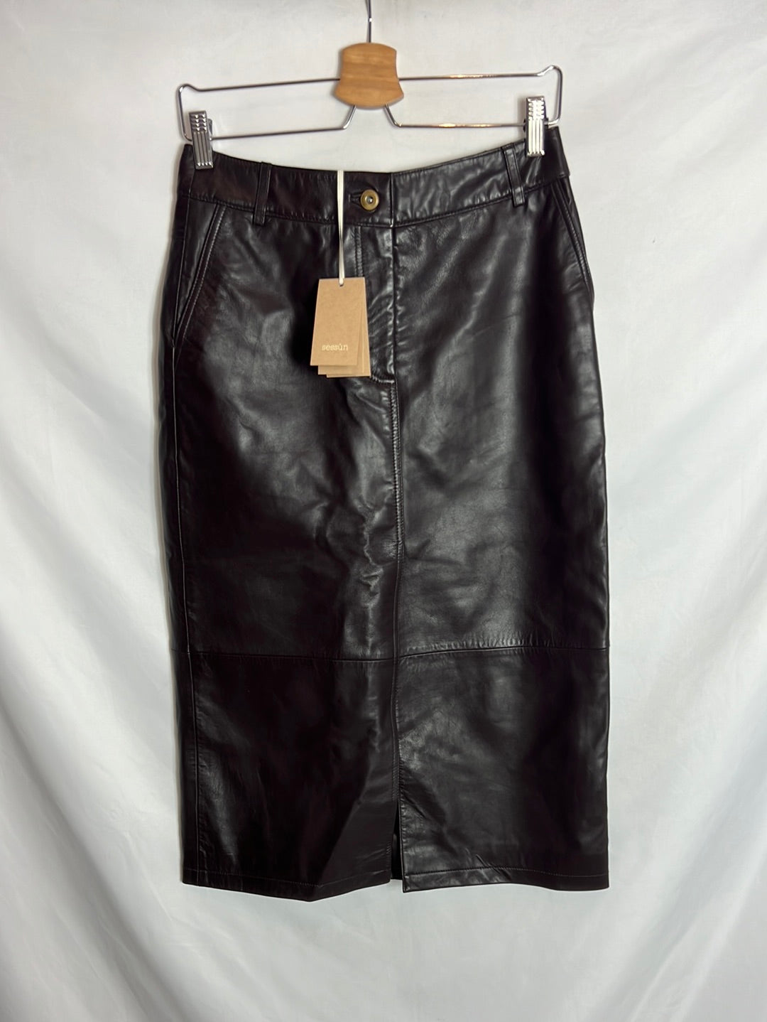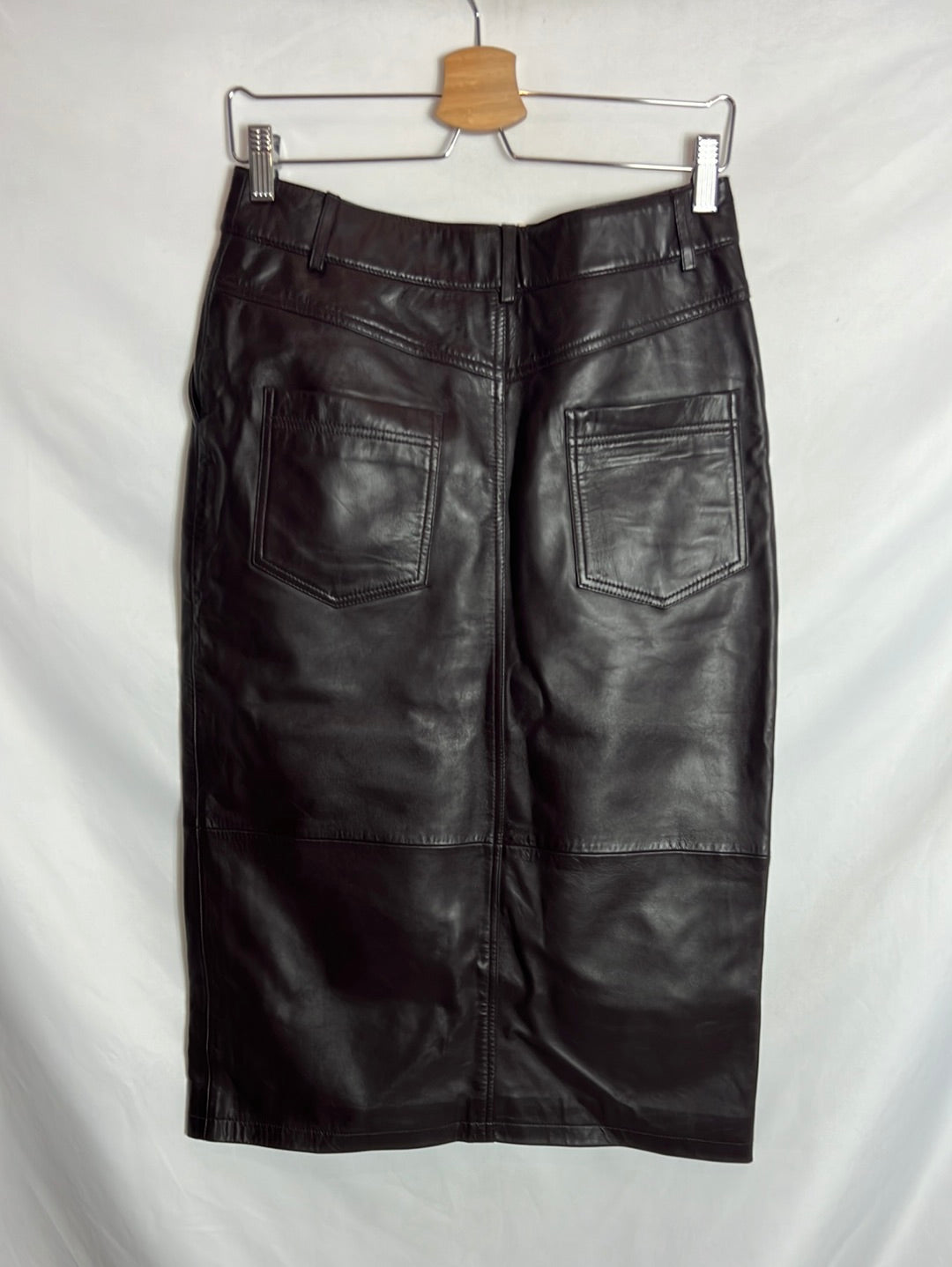 SESSÚN. Falda midi piel marrón apertura. T 38