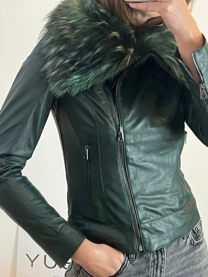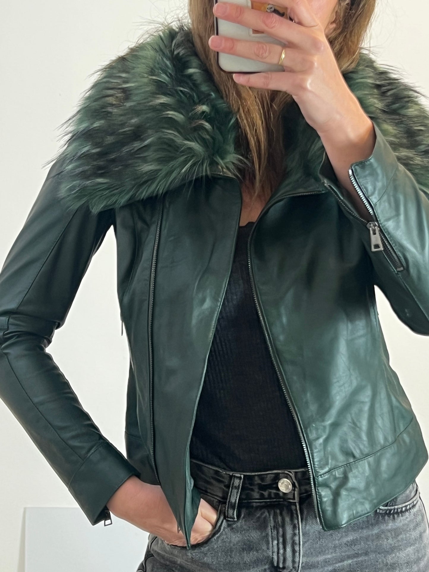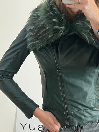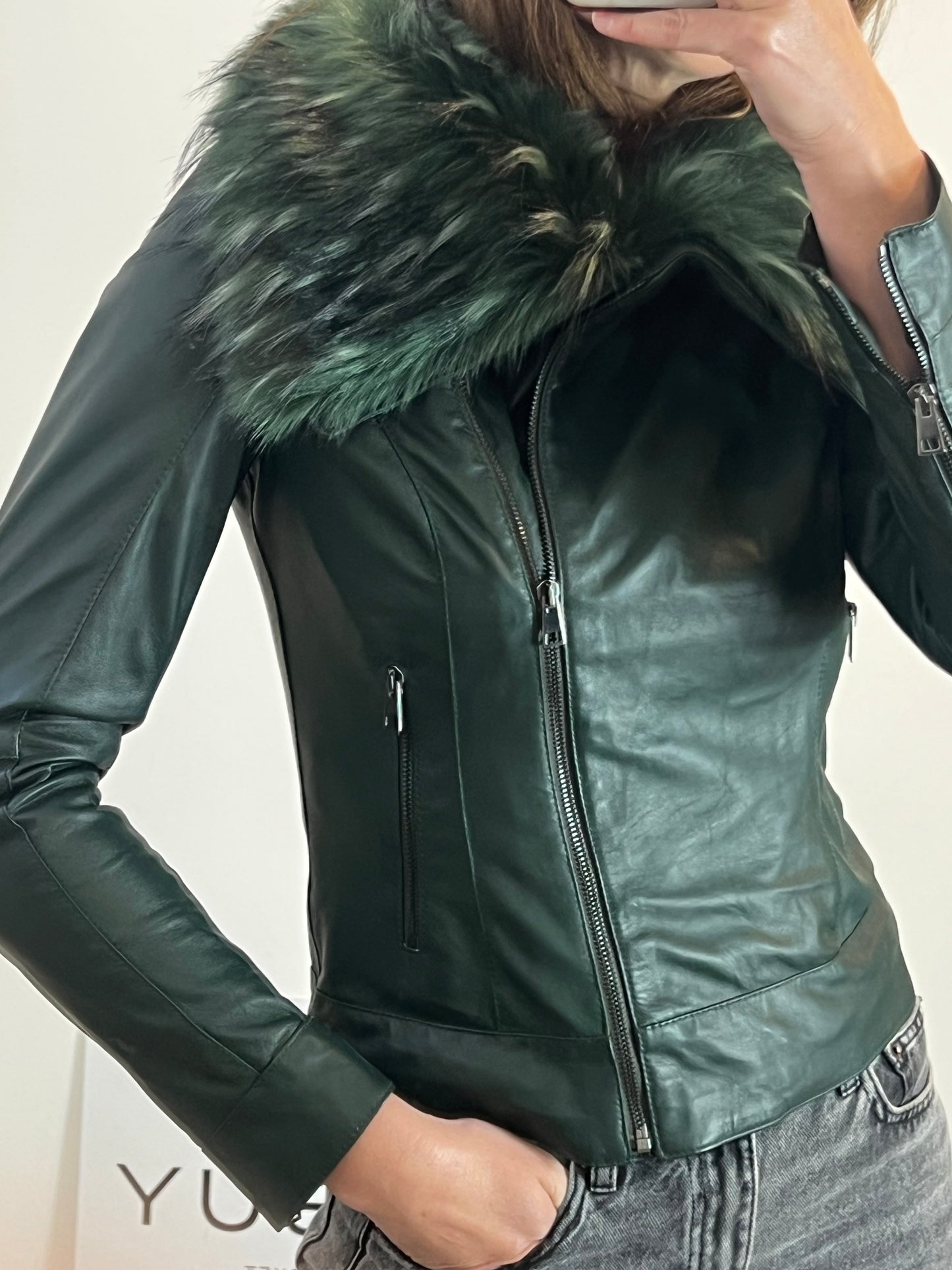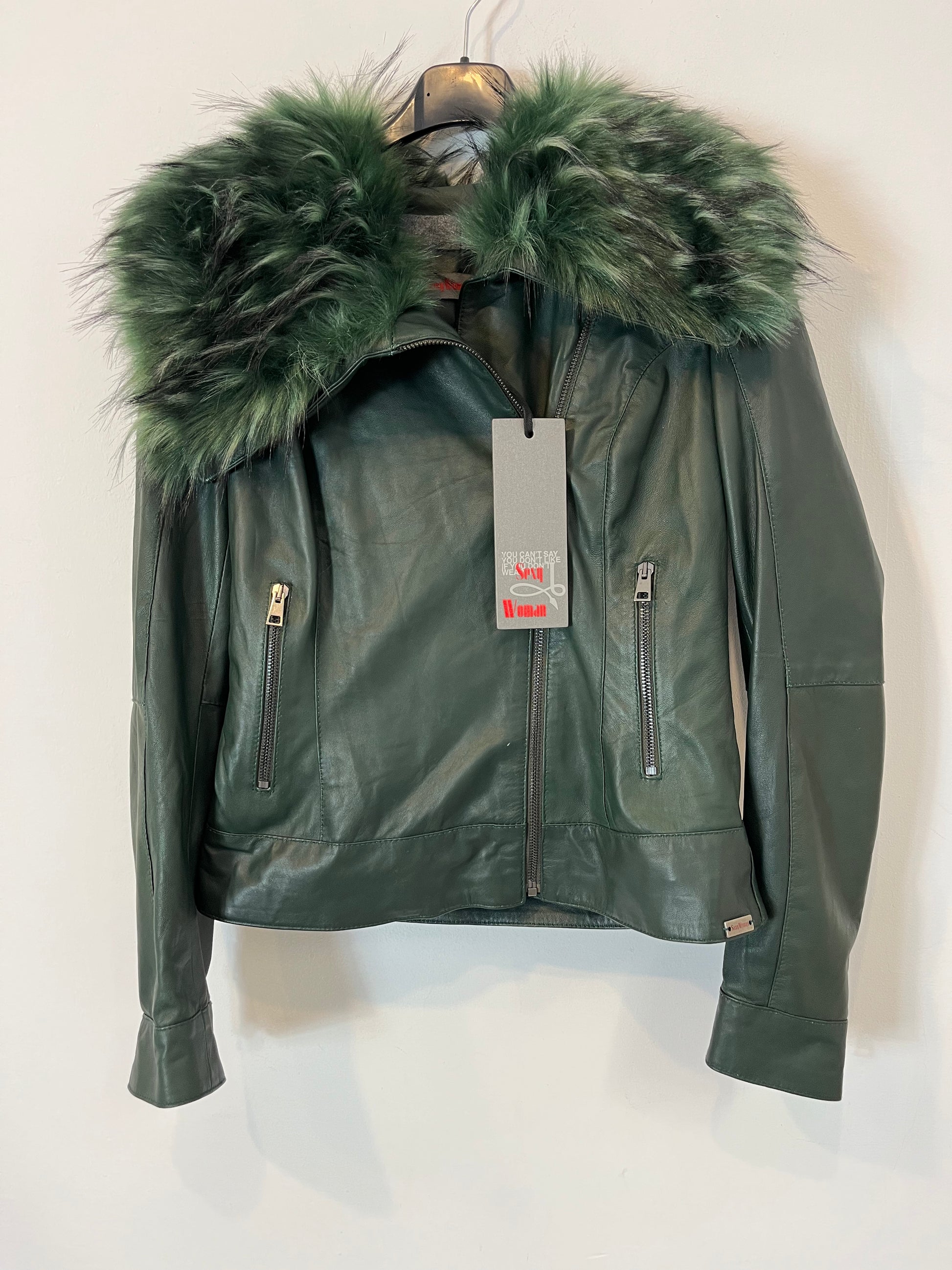 SEXY WOMAN. Chaqueta piel verde cuello pelo. T S