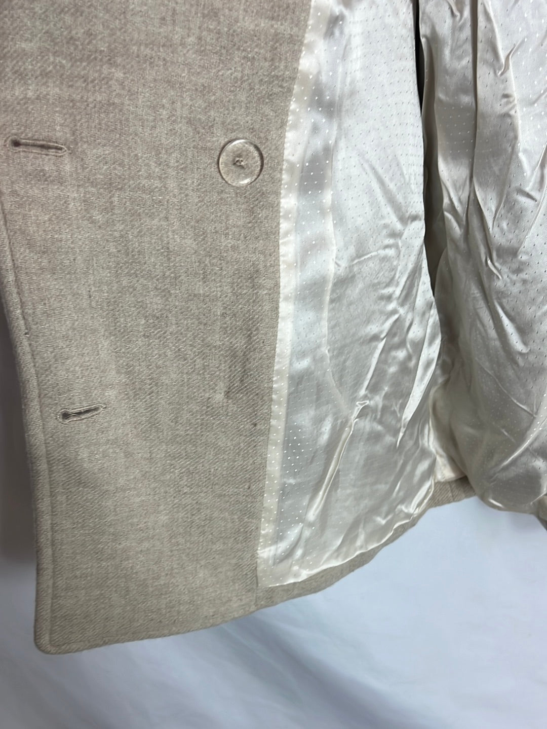 Abrigo lana beige cruzado. de sisa a sisa 55cm, largo 80cm la. Tara: tiene alguna pelotilla en la manga parte interior