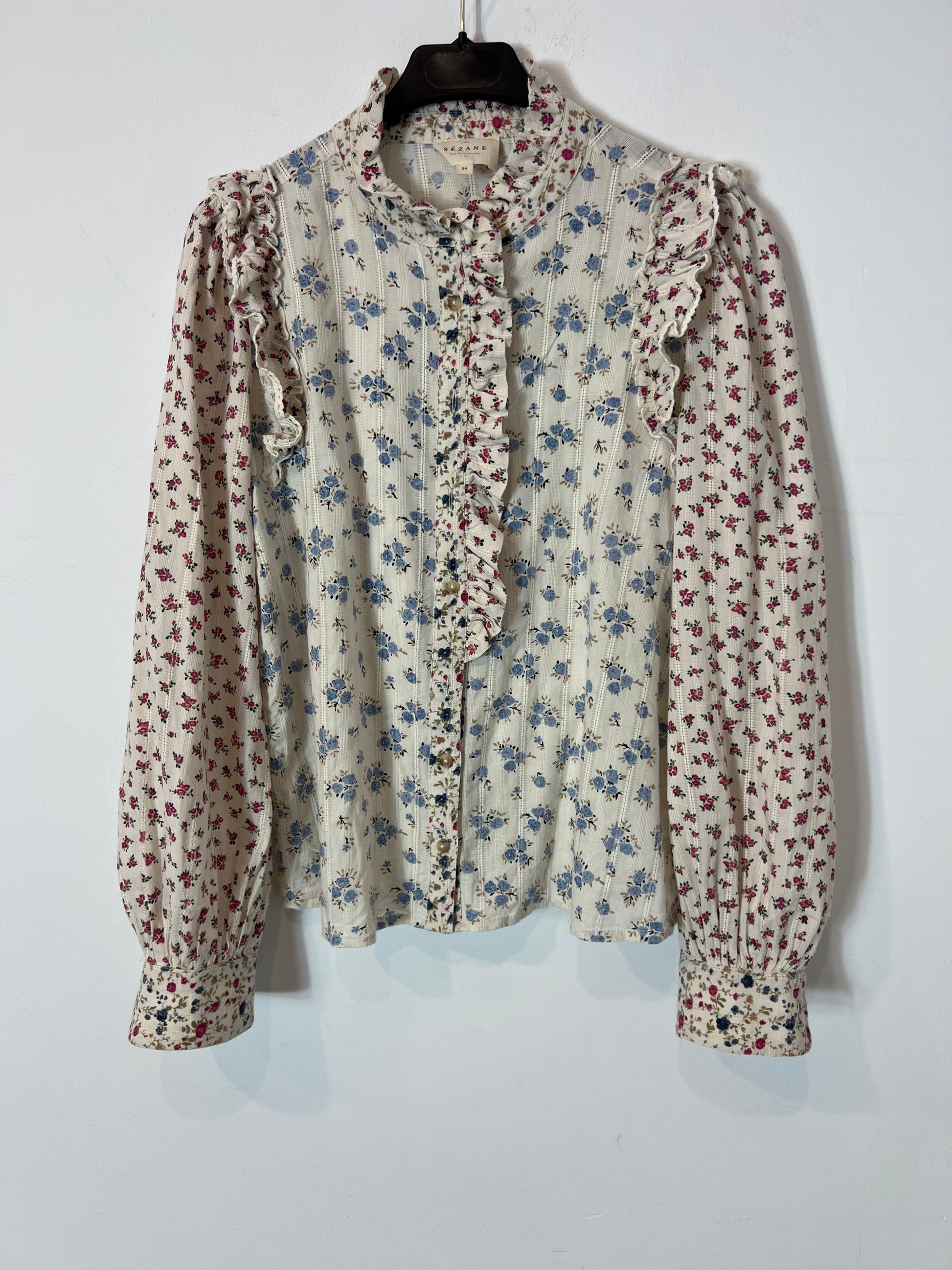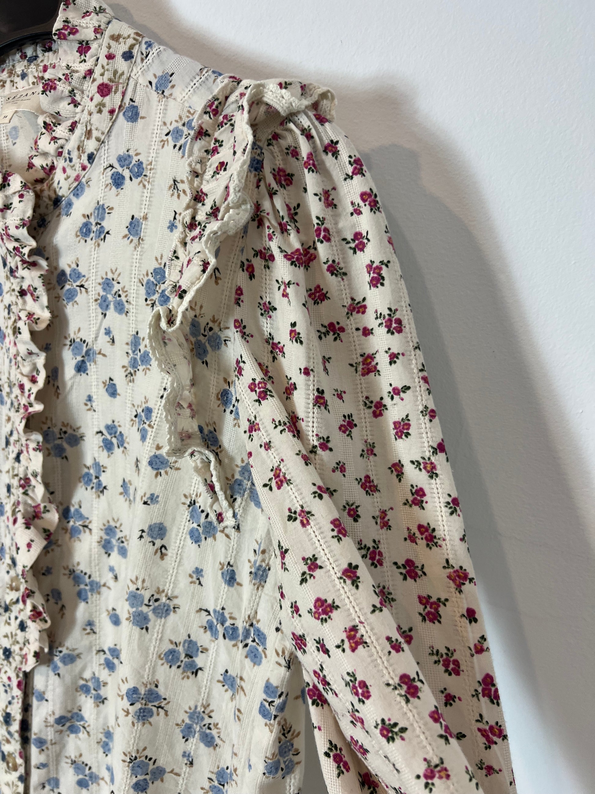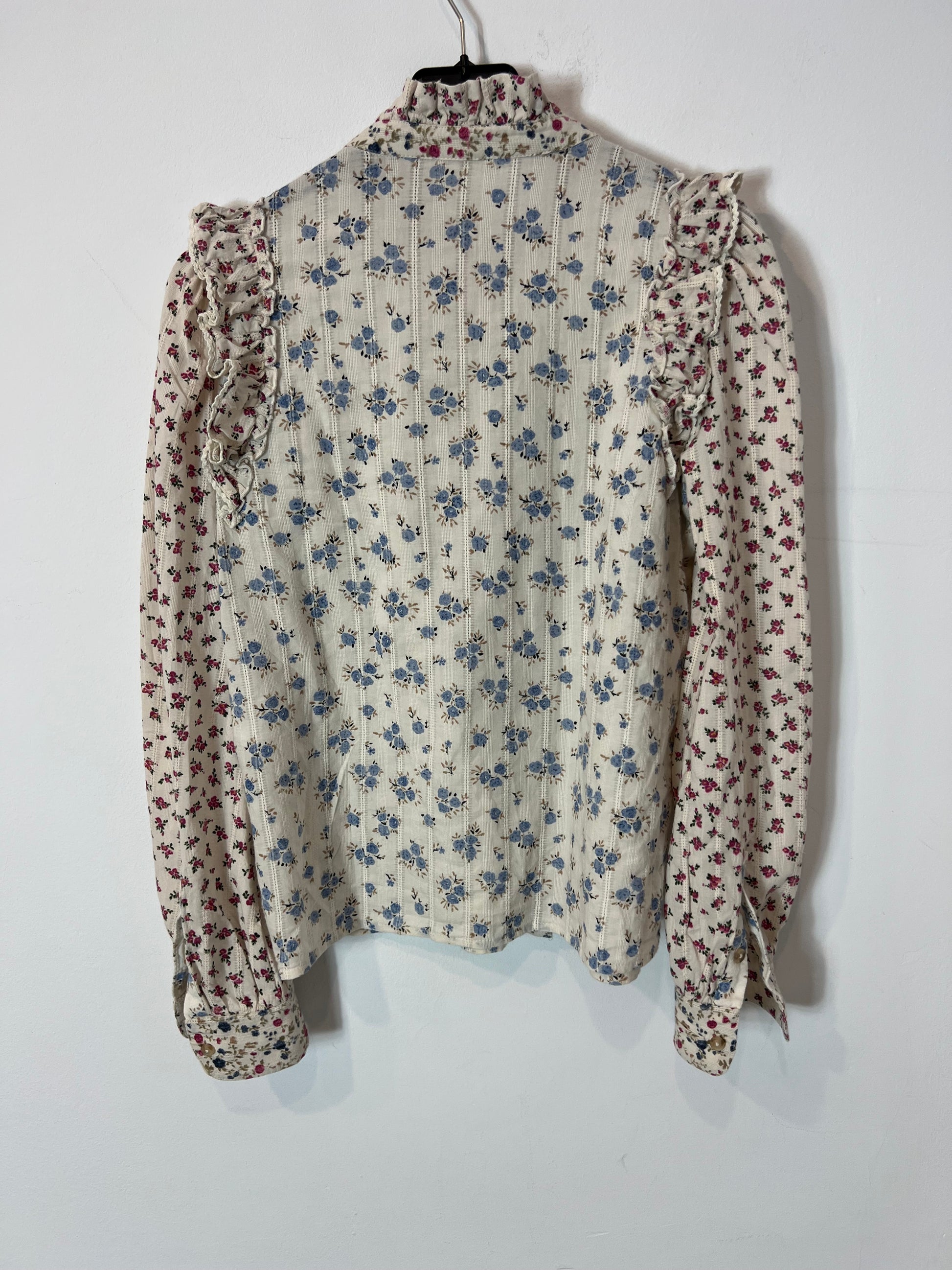 blusa beige con estampado de flores en azules y rosas . De sisa a sisa 49cm, largo 61cm