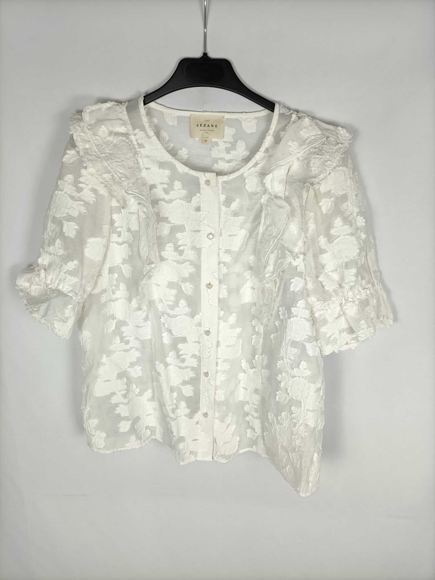 SEZANE. Camisa blanca semitransparente con flores bordadas T. 36