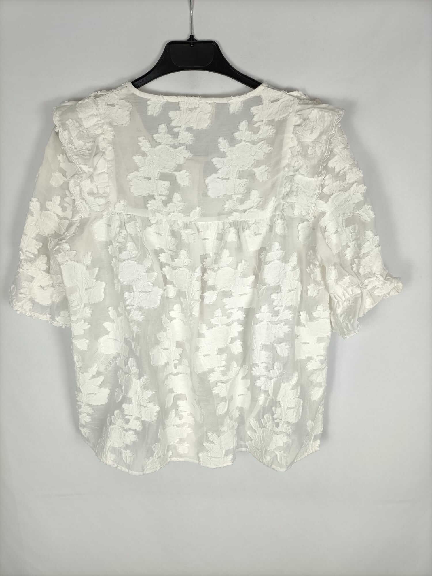 Sezane. Blusa blanca bordada con las mangas abullonadas y semitransparente. Volantes delanteros. De sisa a sisa 51 largo 70 cm