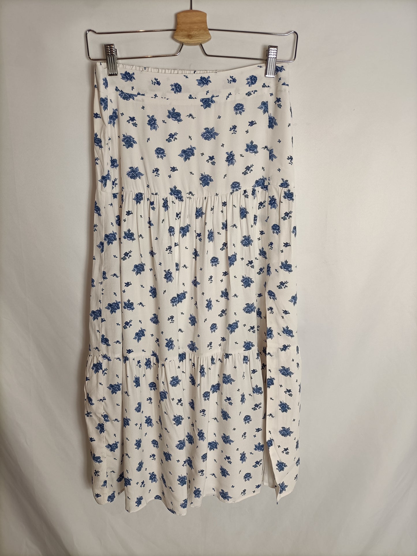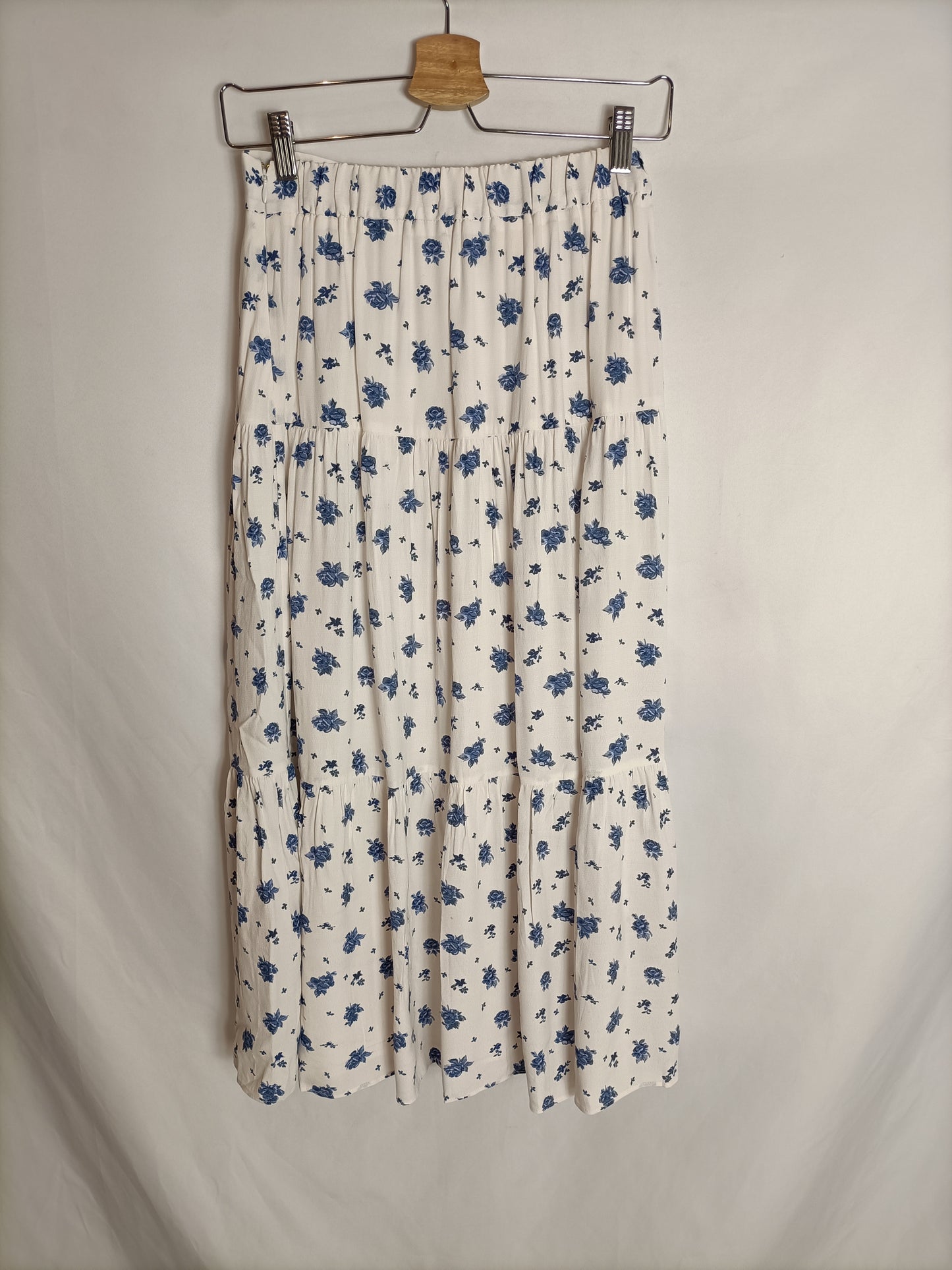 falda midi blanca con flores azules. fluida con la cintura elásticas.