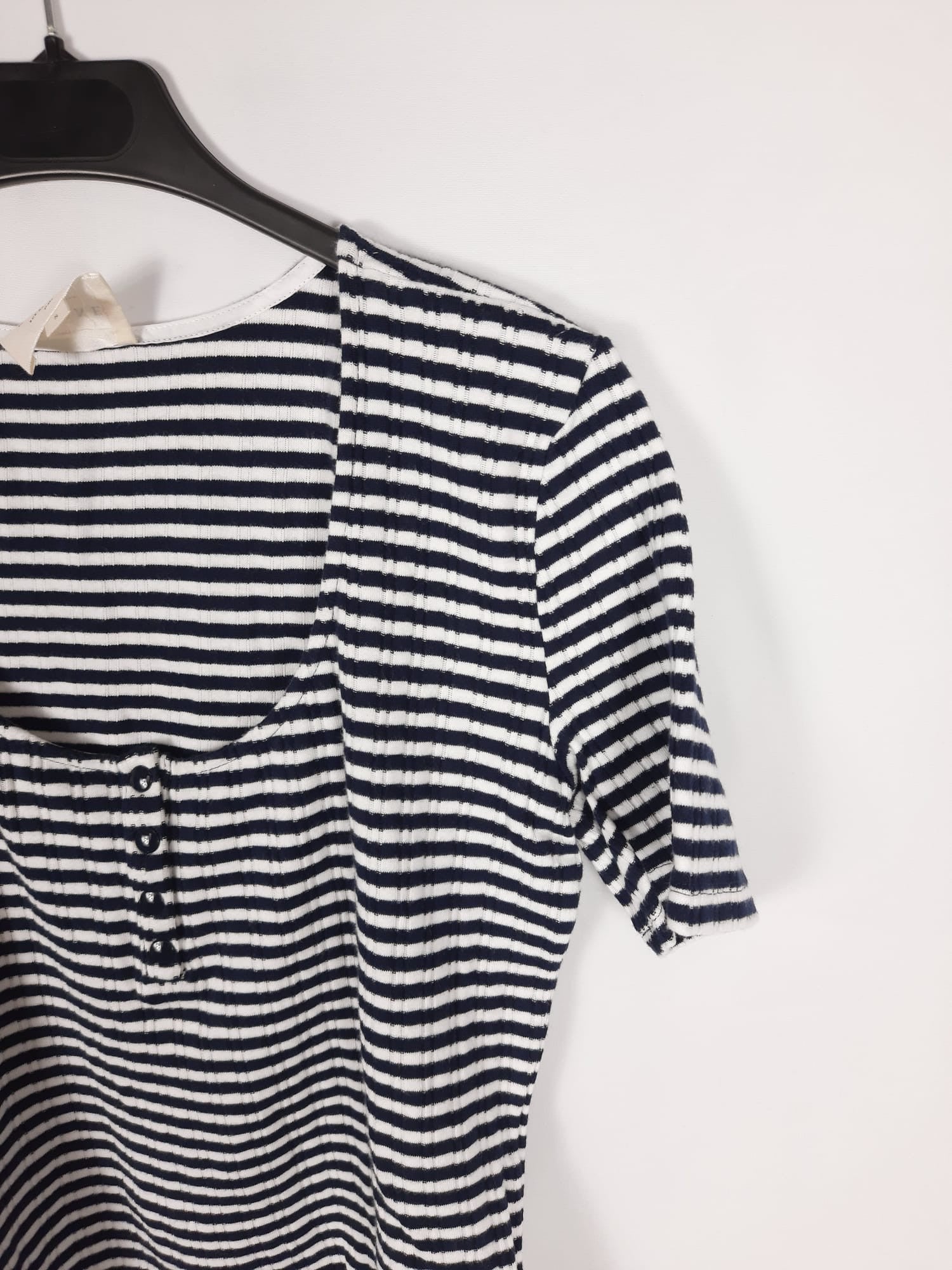 Sezane. Camiseta de rayas azul y blanca con textua y botones en el escote. Elástica. Largo 57 cm