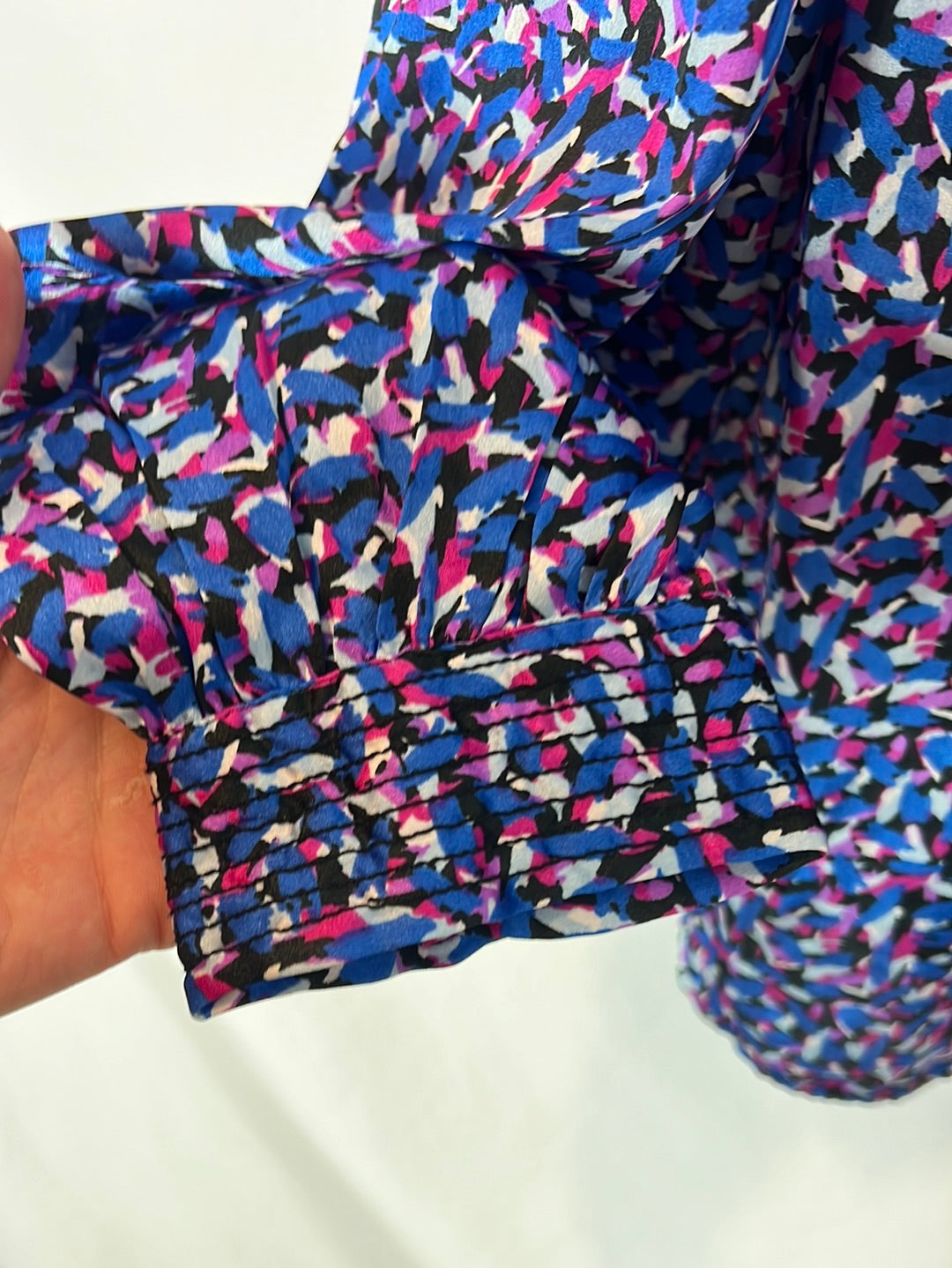 Blusa satinada estampado azules cuello alto. Hombros 37cm, largo 58cm