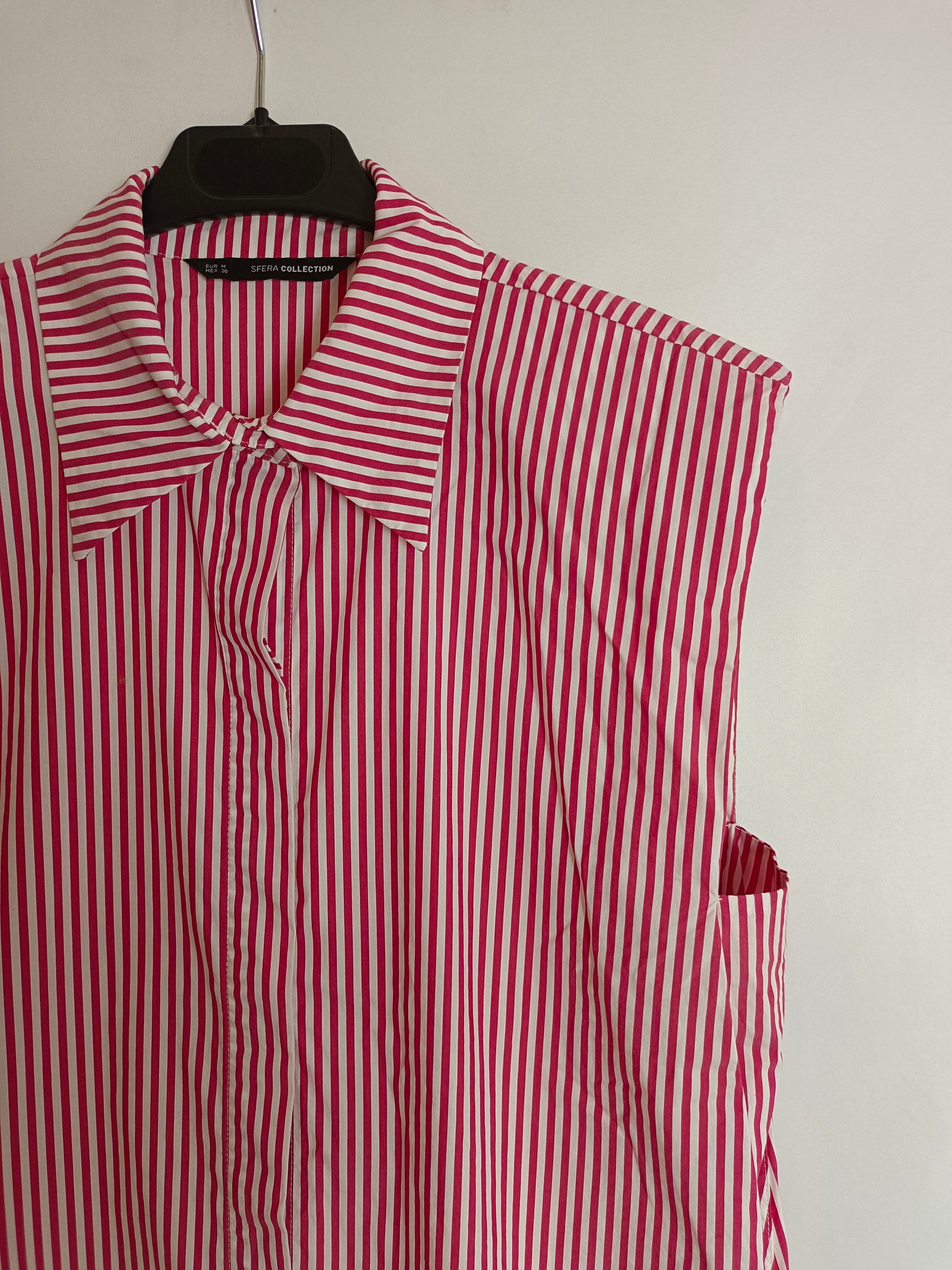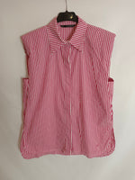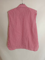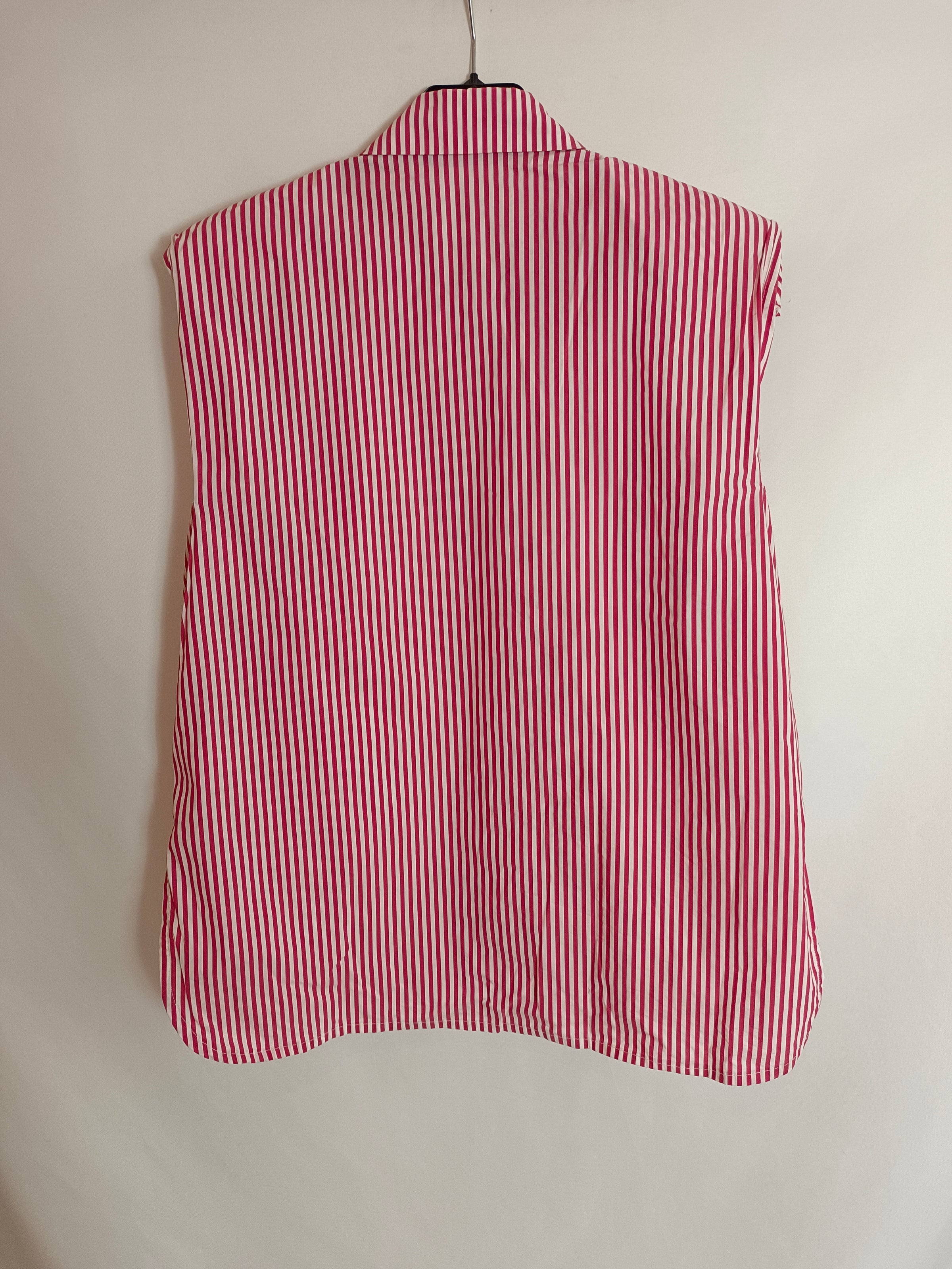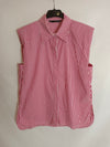 camisa sin mangas de rayas blanco y rojo con flores. Tiene hombreras.