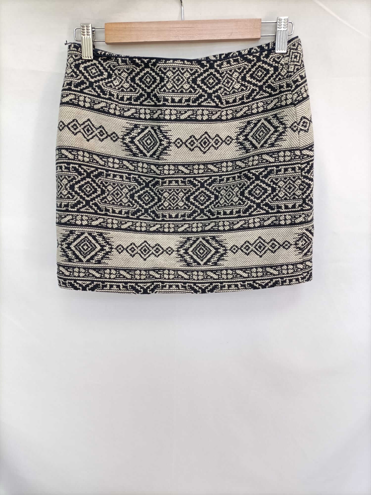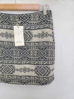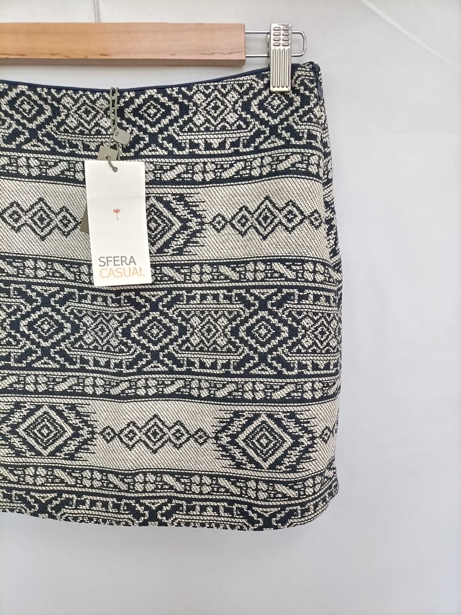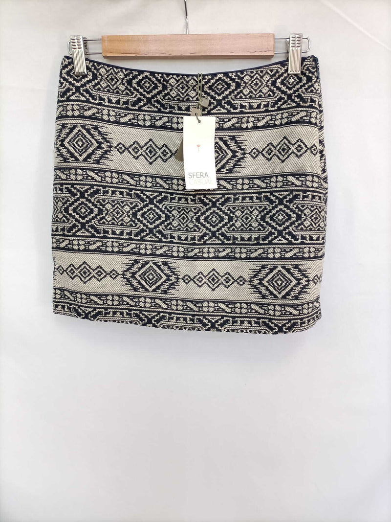 Sfera. S. NUEVO CON ETIQUETA. Falda beige con estampado étnico en negro. Gordita. No elástica. Cintura 38 cm largo 38 cm