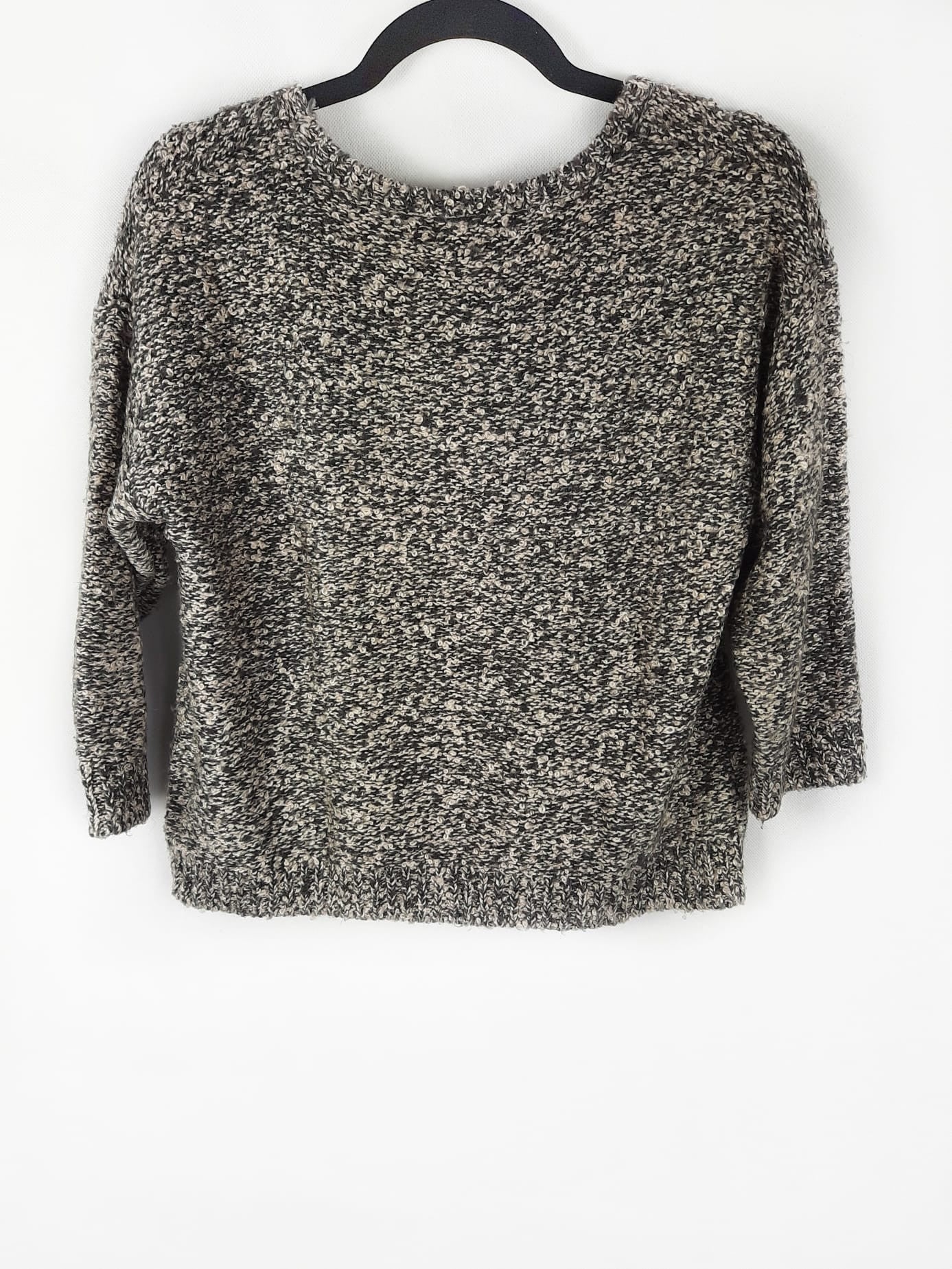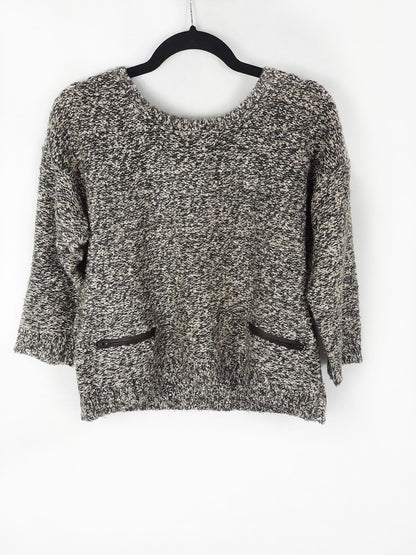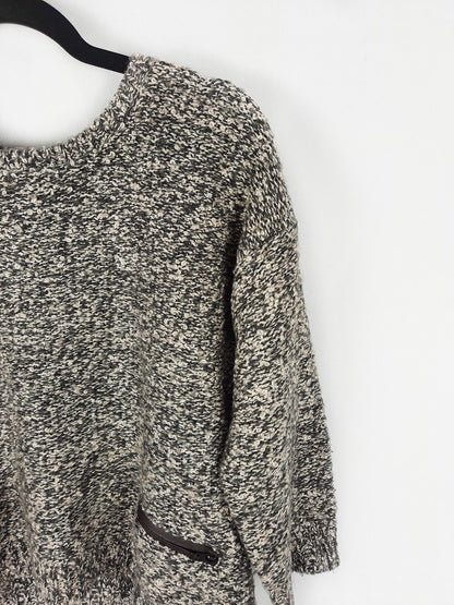Jersey en tonos marrones jaspeado en los bolsillos tiene detalles de cuero. Es elástico y manga 3/4. Largo 56 cm