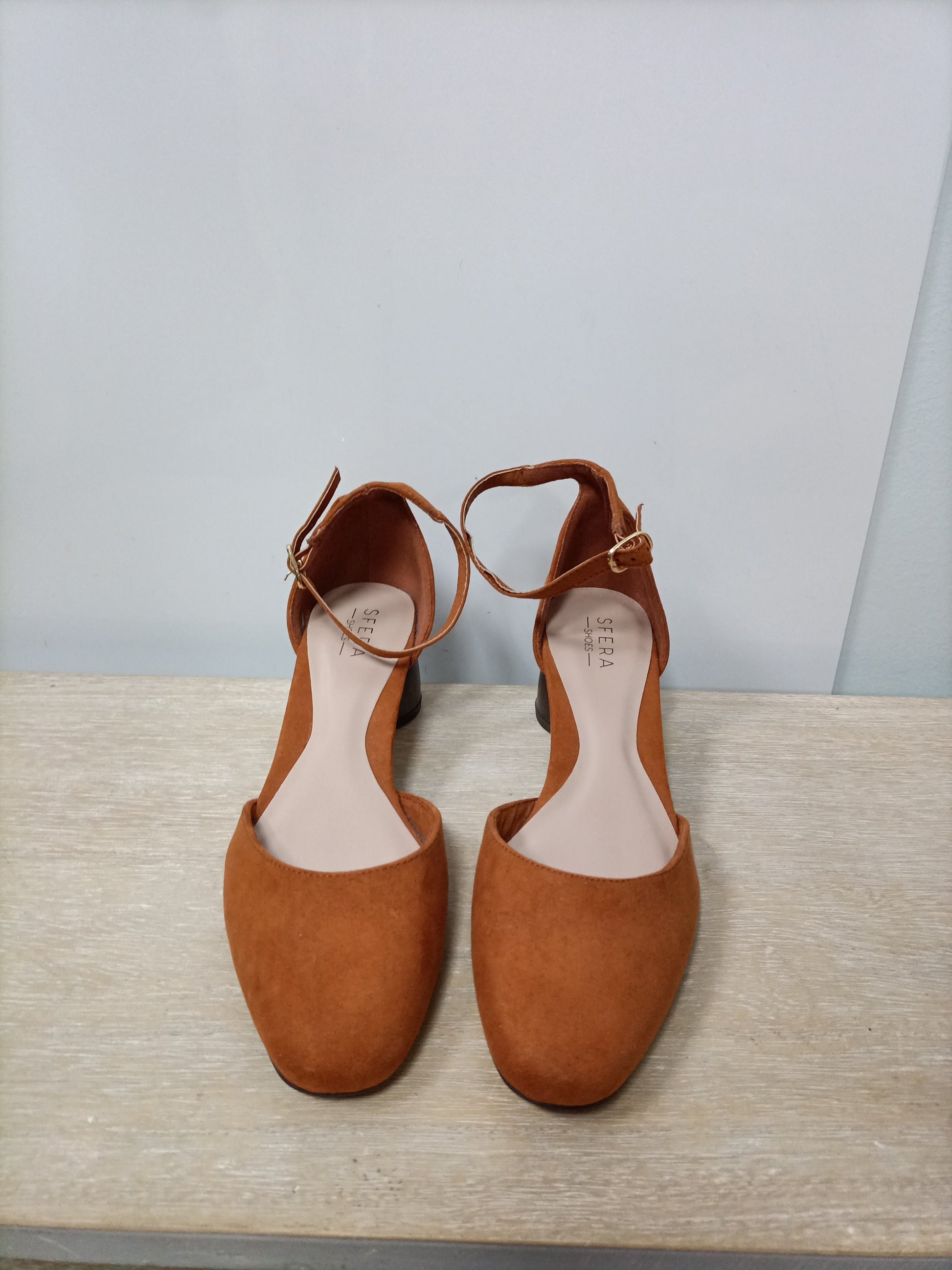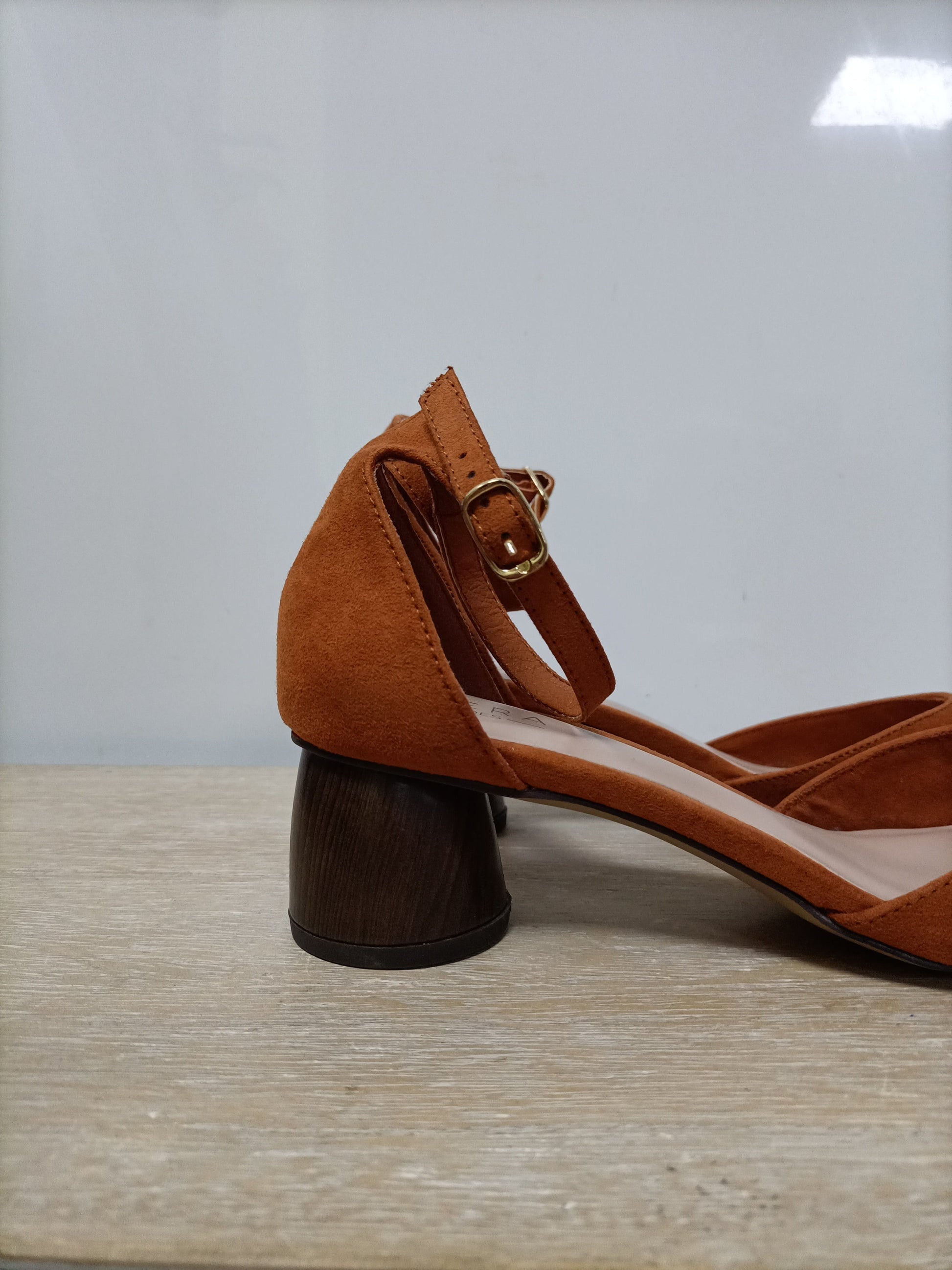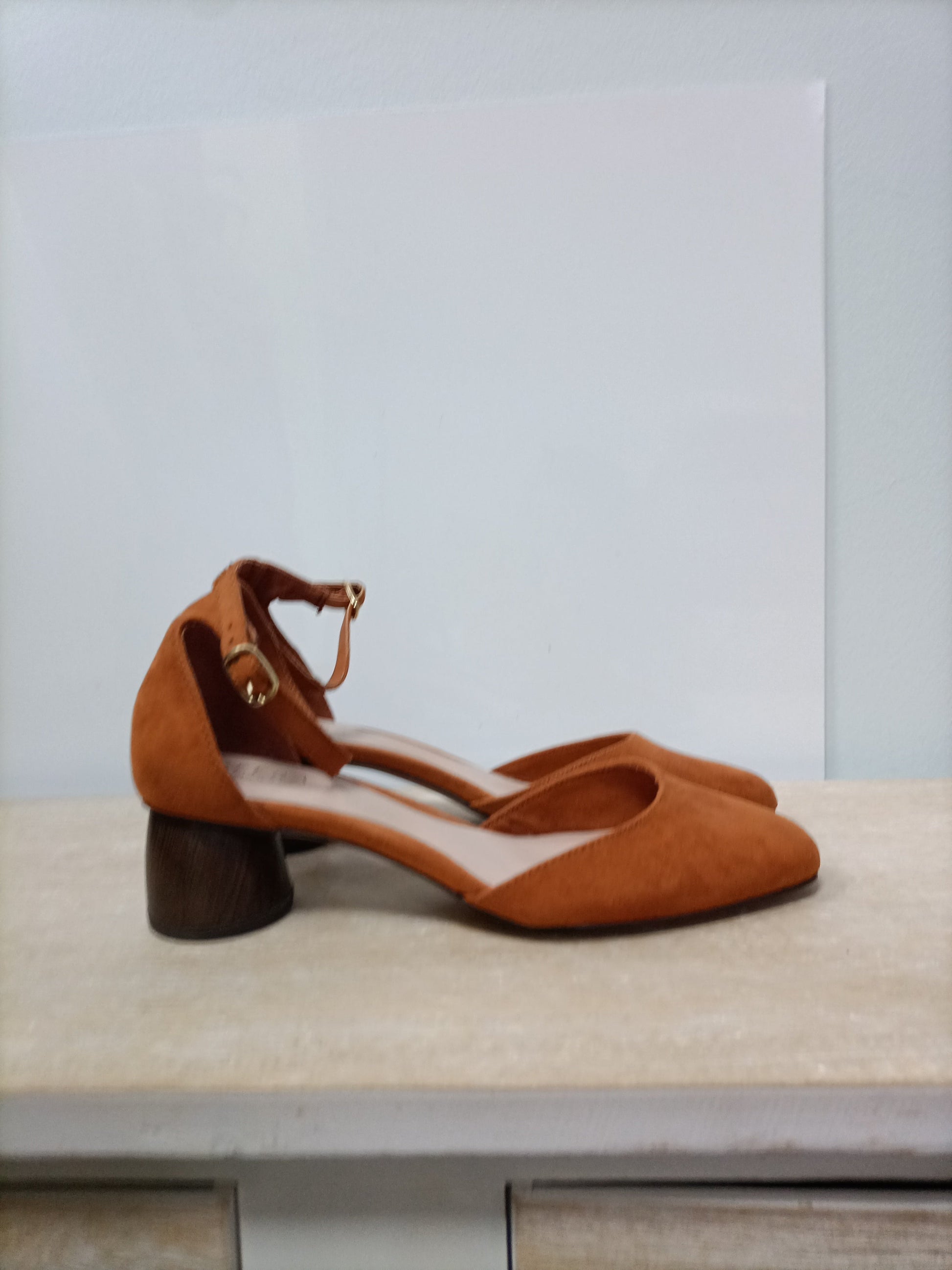 Manoletinas antelina mostaza. tara: tira del tobillo un poco despegada por el interior