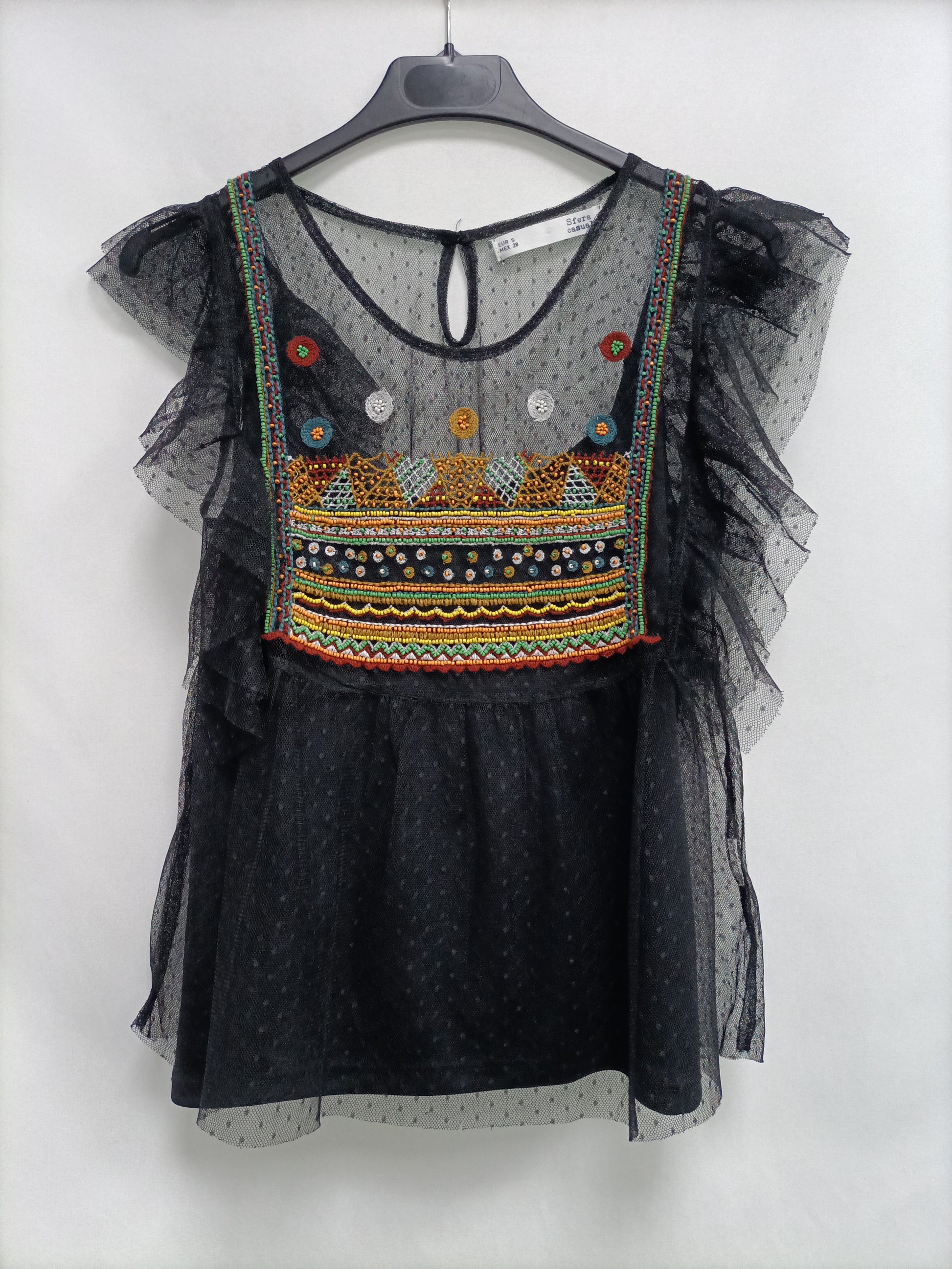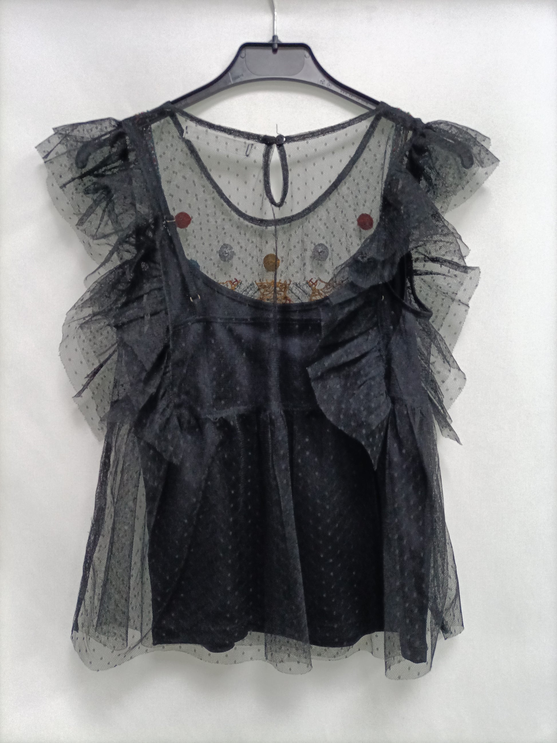 top negro de tull con plumeti y detalles bordado. largo 48 cm