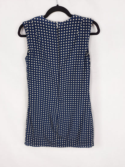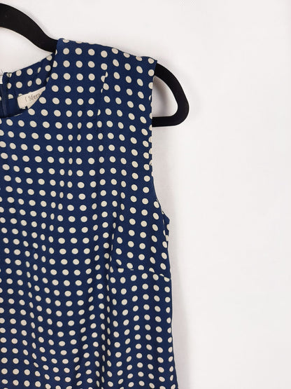 Vestido azul con lunares. Es recto y fino se abrocha con cremallera en la espalda. No es elástico. De sisa a sisa 43 cm , largo 80 cm