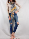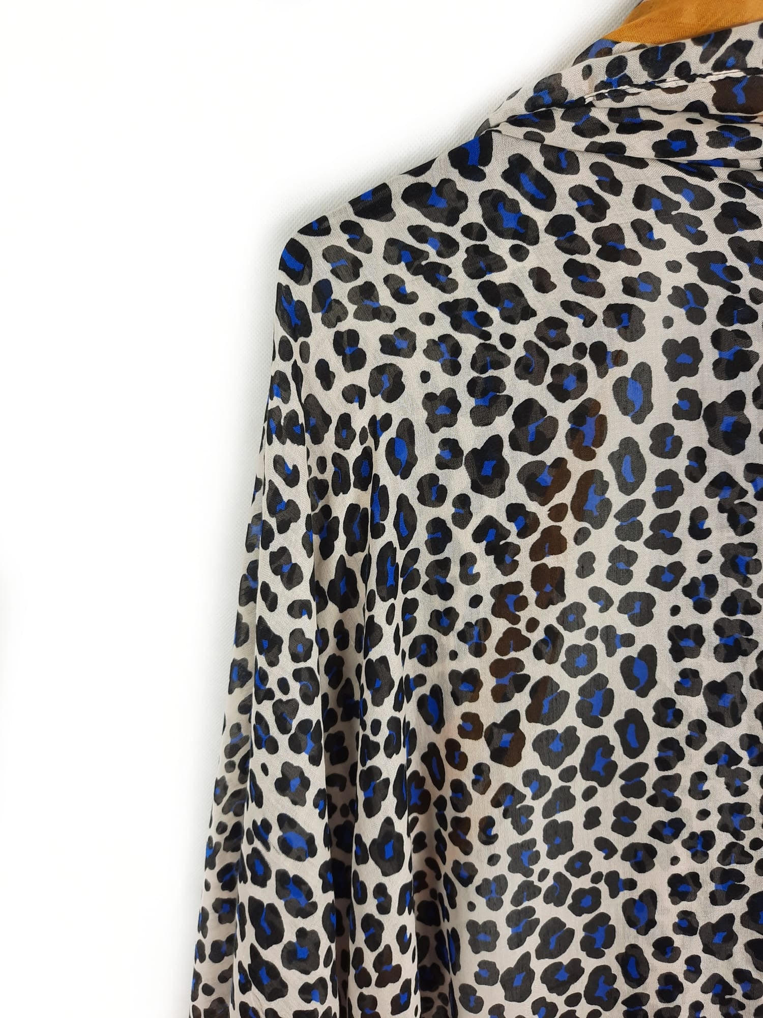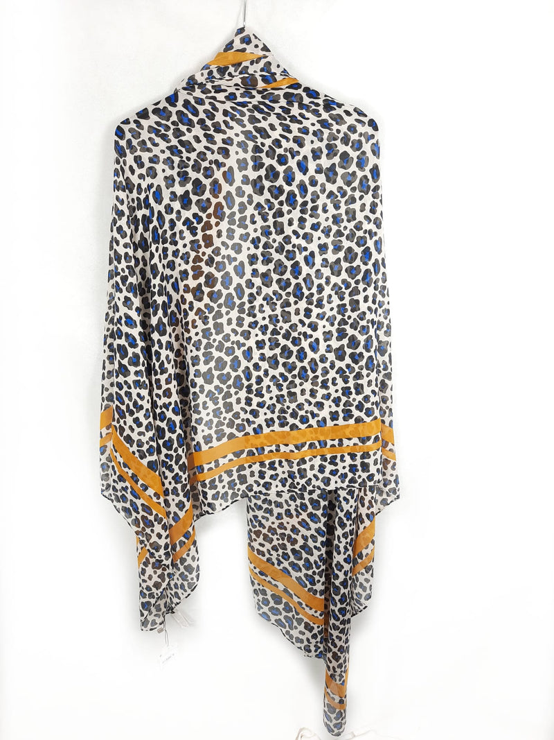 NUEVO CON ETIQUETA. Fular animal print en tonos beiges, azules y mostaza