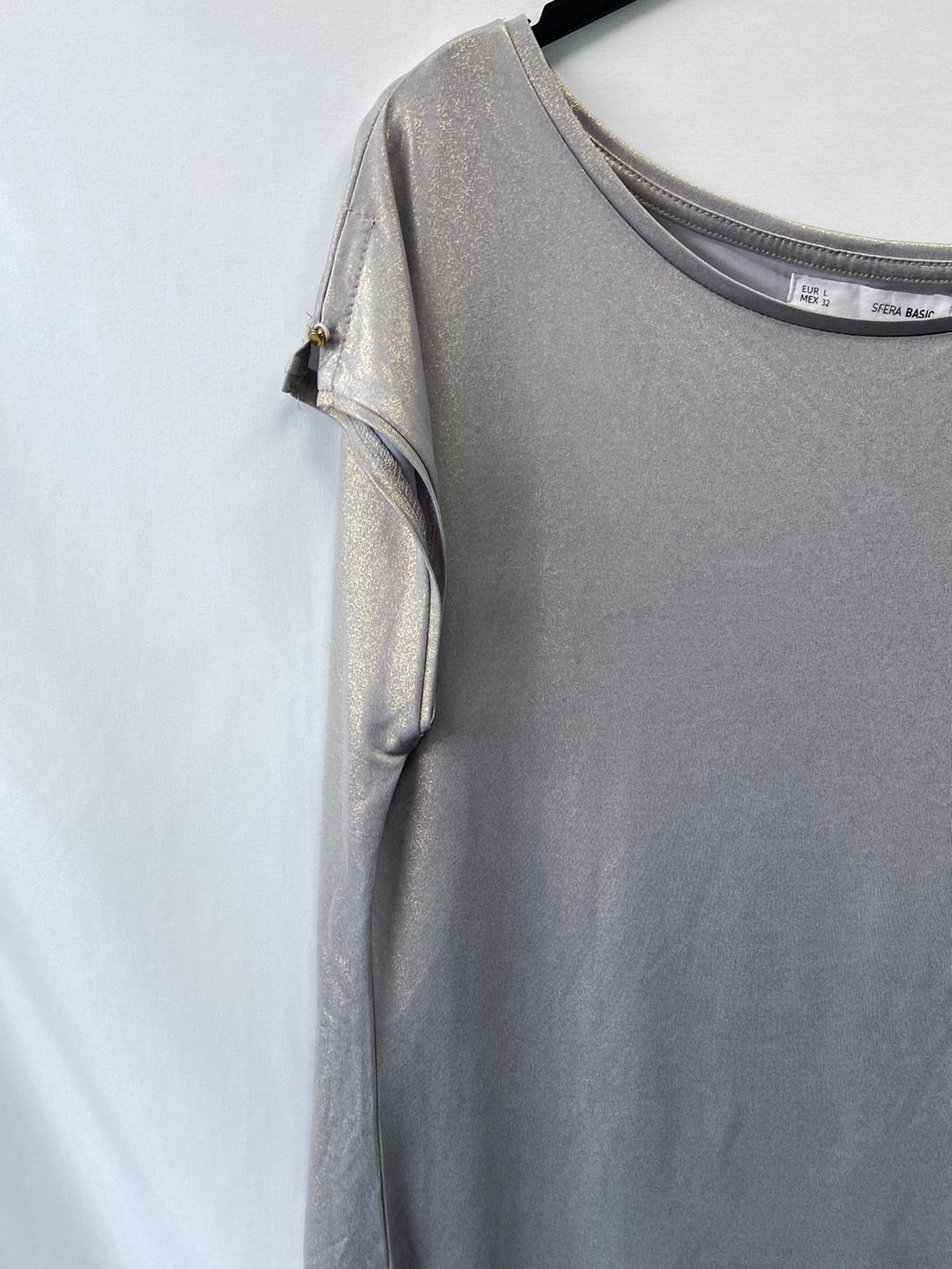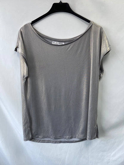 Camiseta plateada con purpurina dorada, muy finita y fluida. Largo 62 cm
