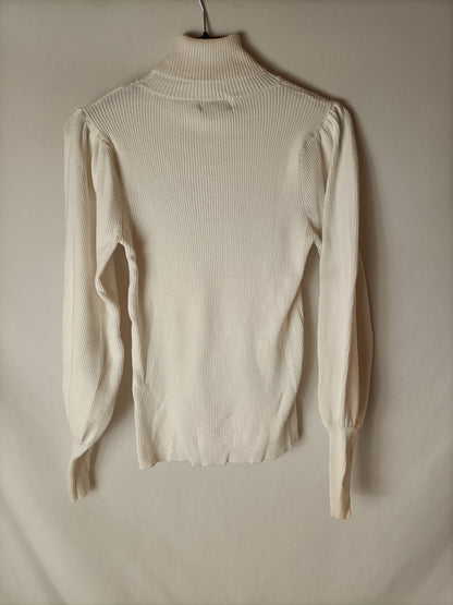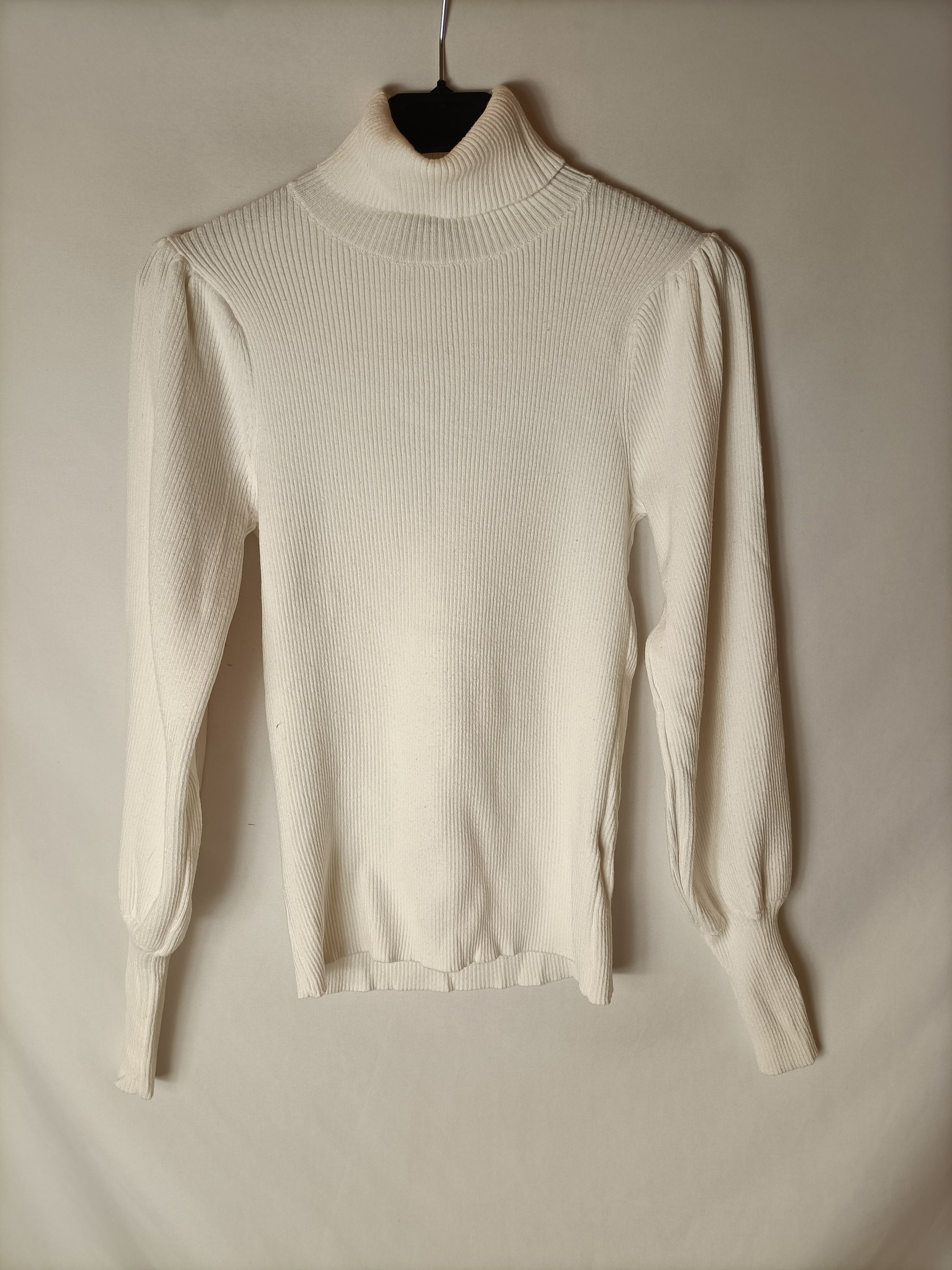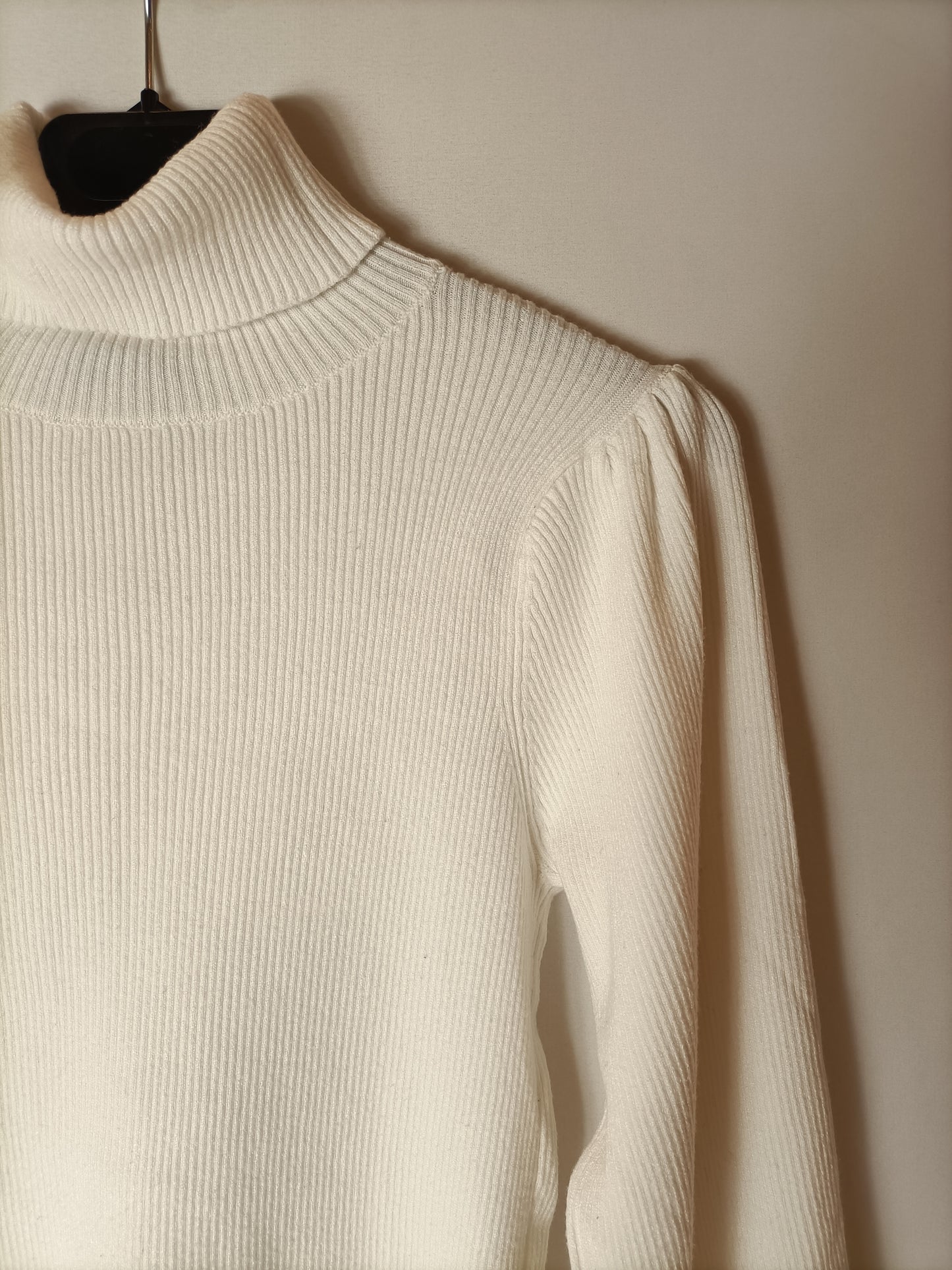 jersey blanco entallado de canalé. mangas ligeramente abullonadas.