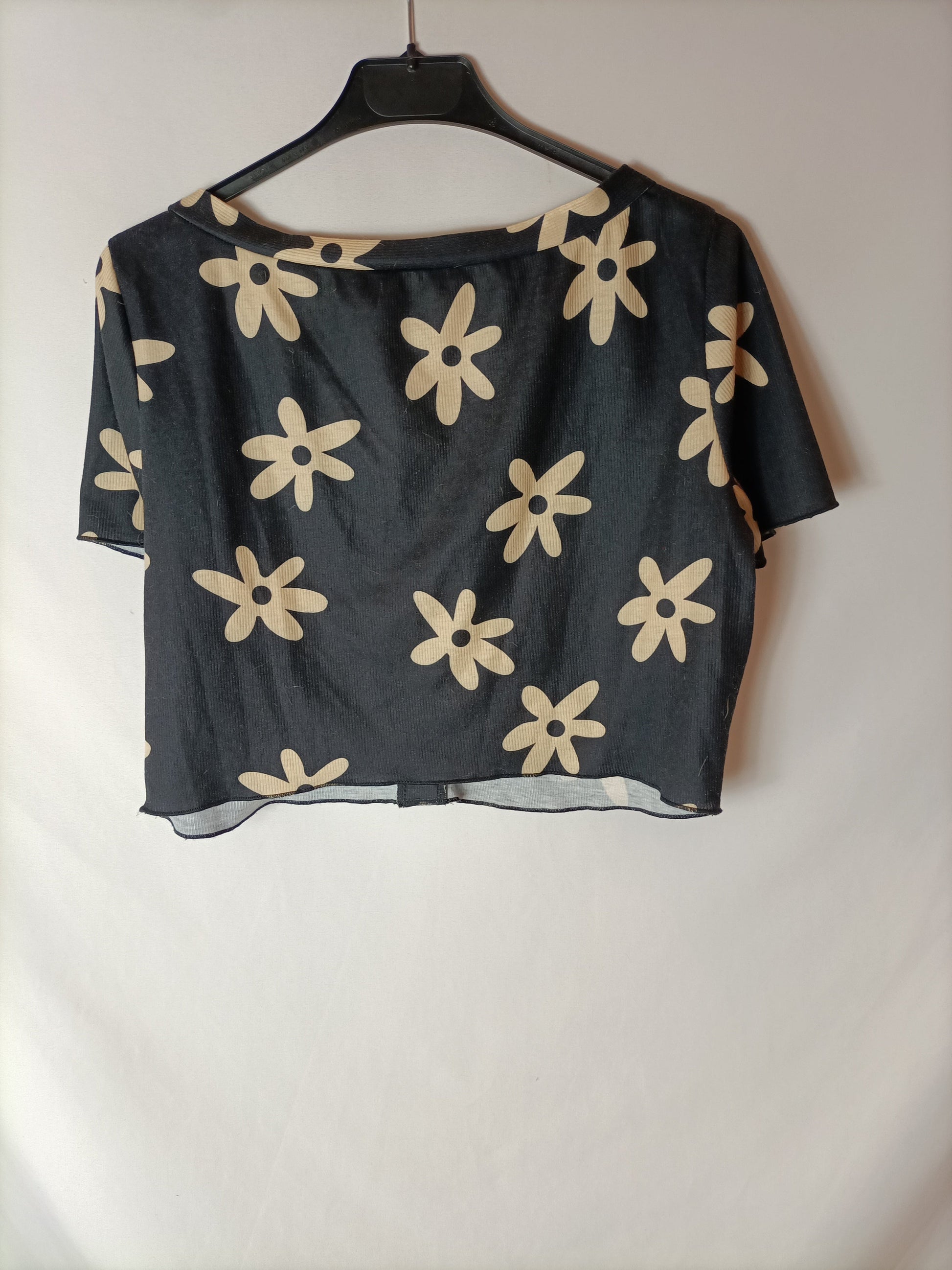 top negro fluido y elástico de tejido de canalé con flores en beige.
