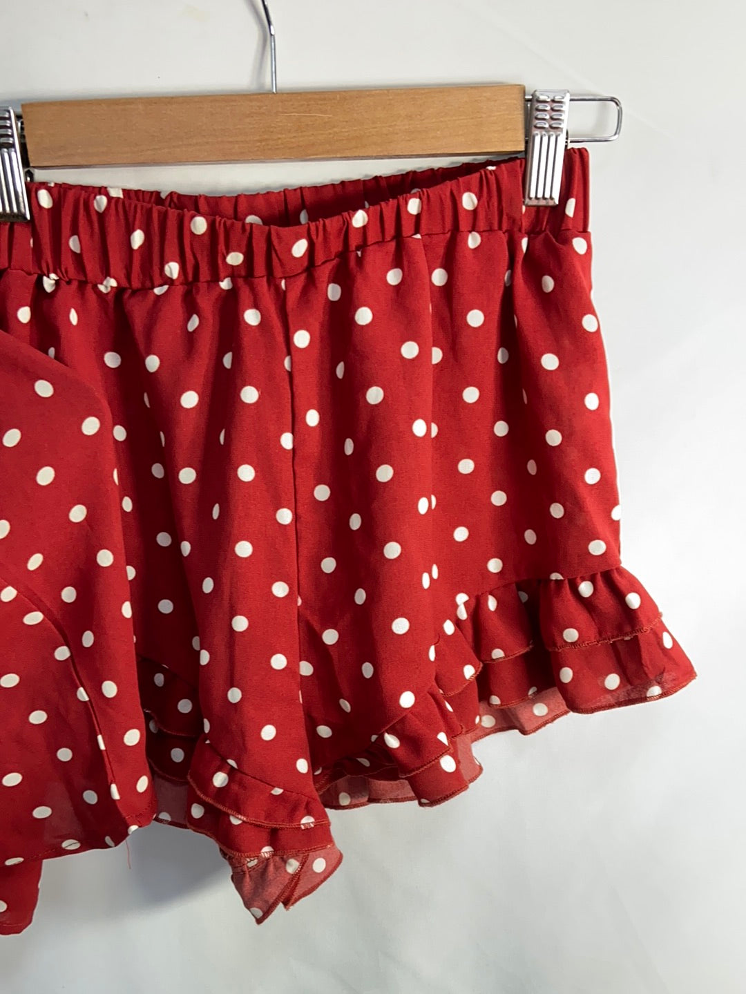 Total look de croptop y shorts rojos oscuros con lunares blancos.