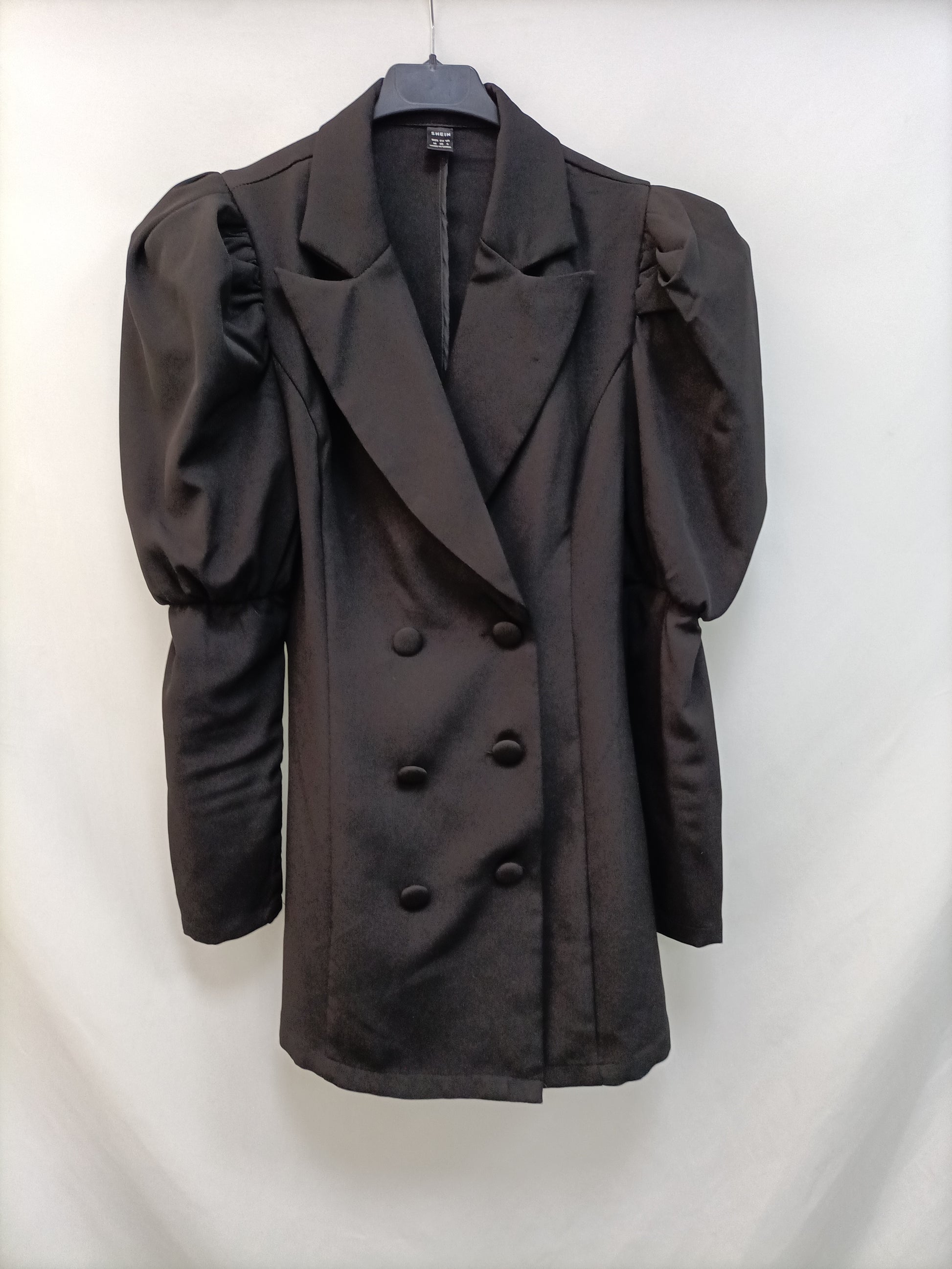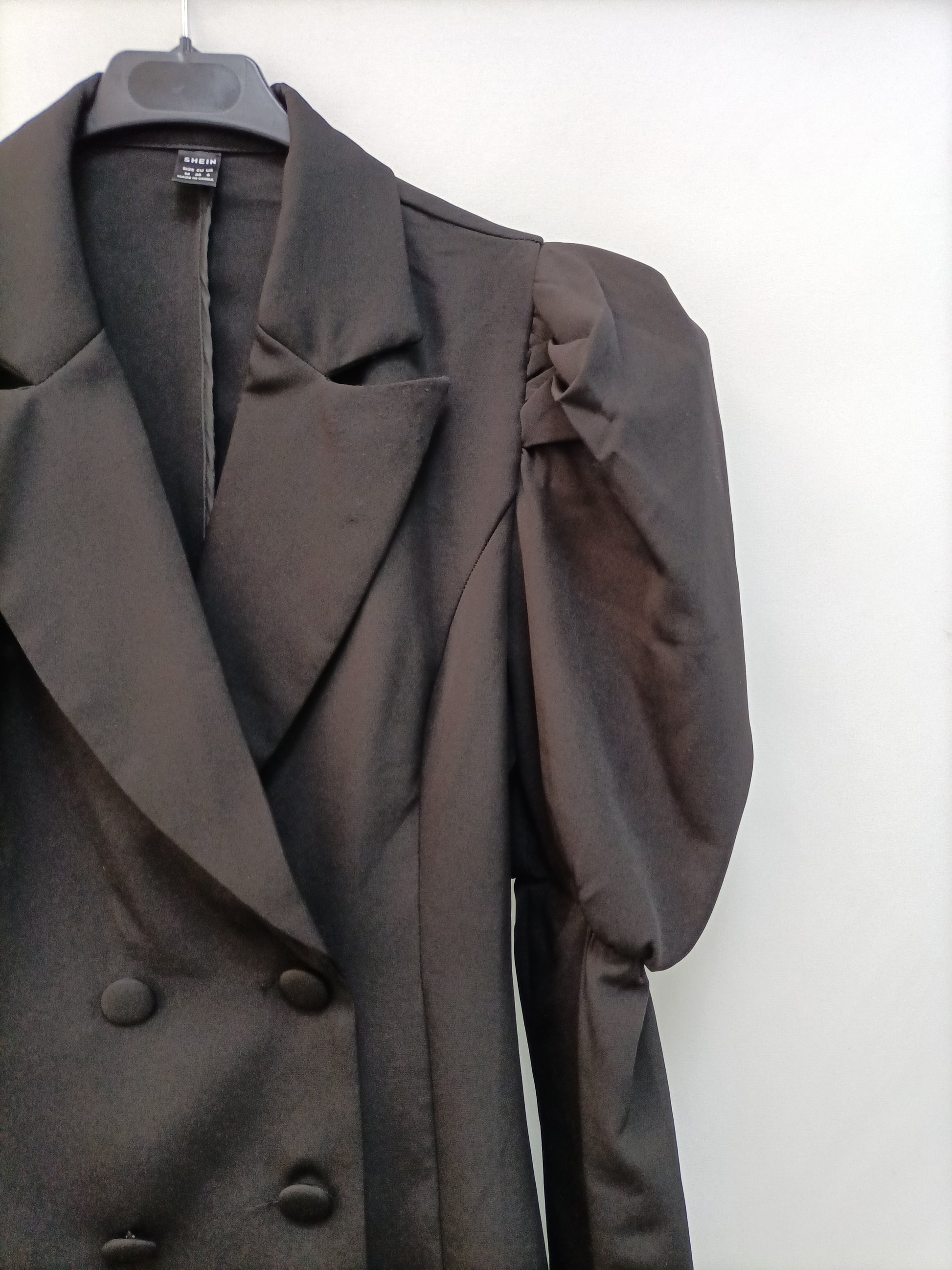 vestido negro cruzado con las mangas ligeramente abullonada. no elástico. de sisa a sisa 44 cm largo 79 cm