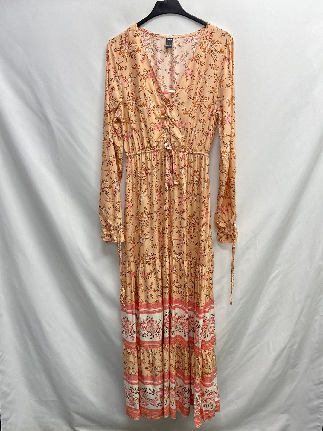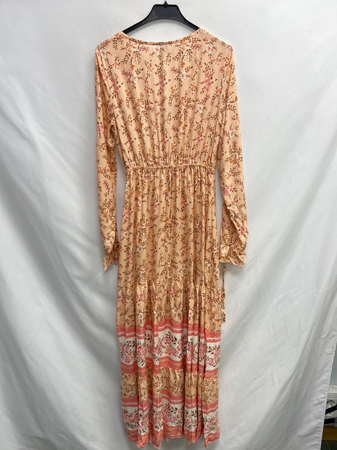 Vestido largo naranja pastel de flores. cuerda en el escote. de sisa a sisa 42 cm largo 142 cm