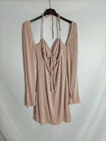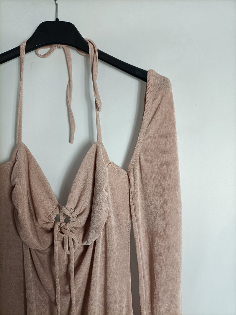 Vestido entallado rosa atado al cuello con mangas y hombro al descubierto.