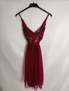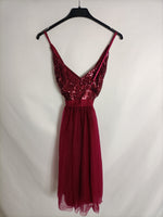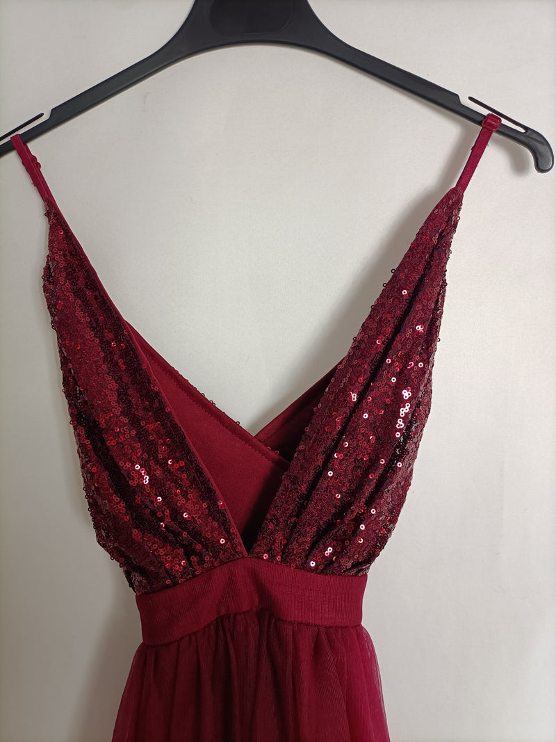 Vestido burdeos de tull con escote de lentejuelas. Tirantes ajustables.