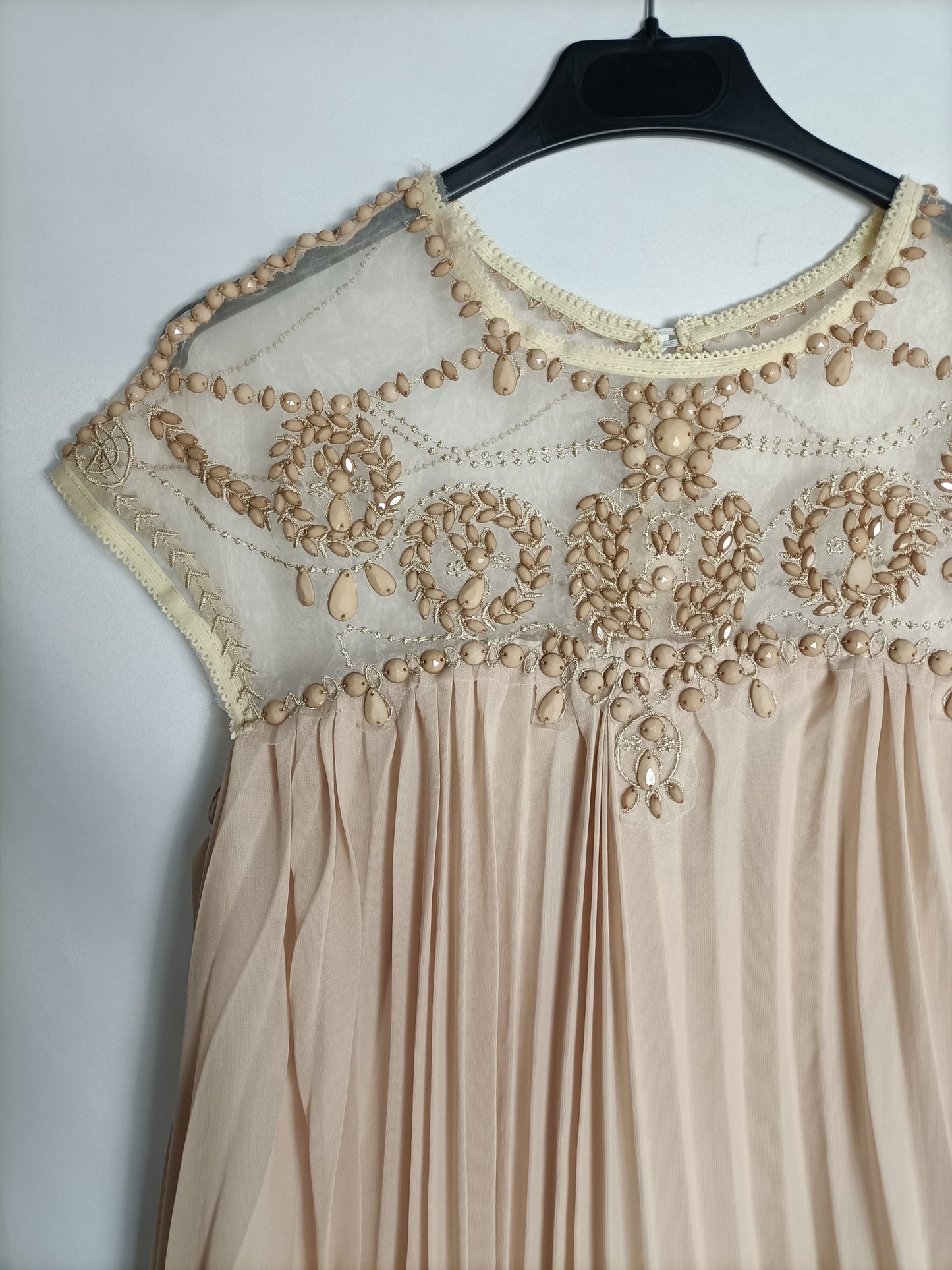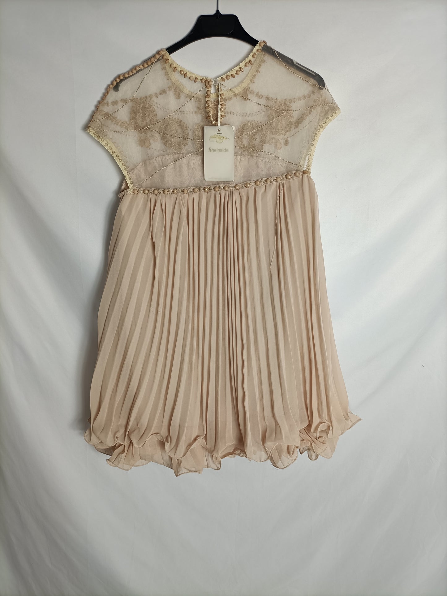 NUEVO CON ETIQUETA. Vestido beige plisado detalle pedrería y transparencia