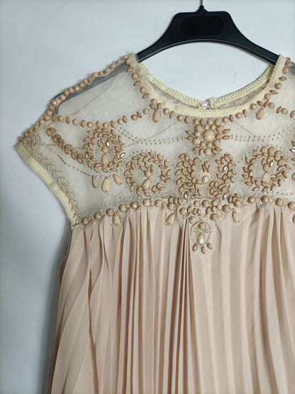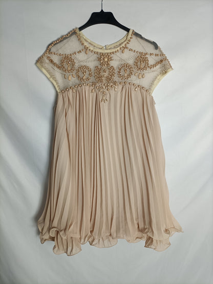 SHEINSIDE. Vestido beige plisado detalle pedrería y transparencia. T S