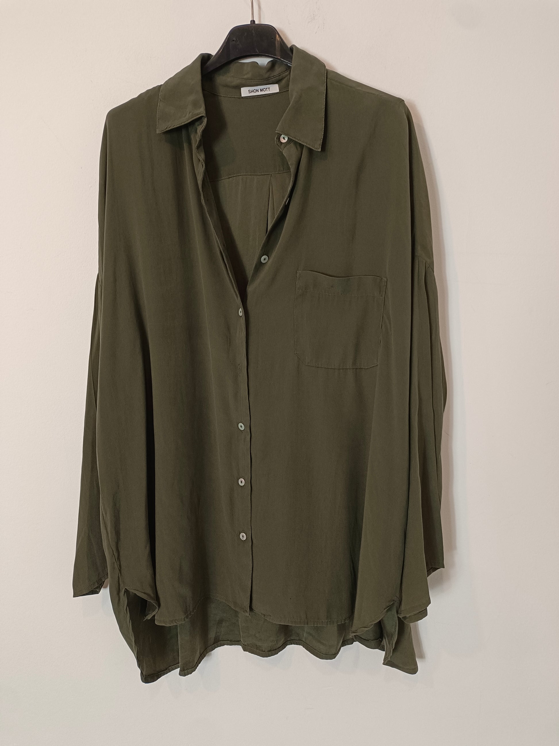 Blusa verde abotonada oversized. 92% seda. De sisa a sisa 74 cm largo 81 cm