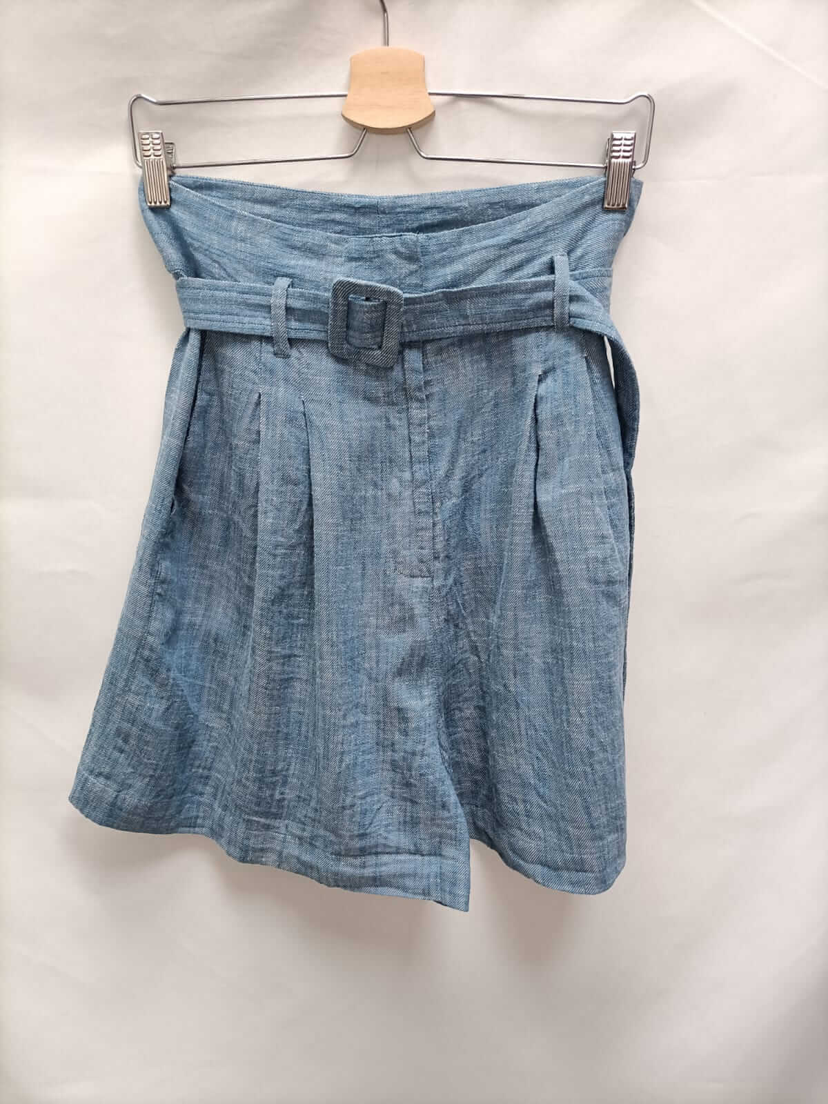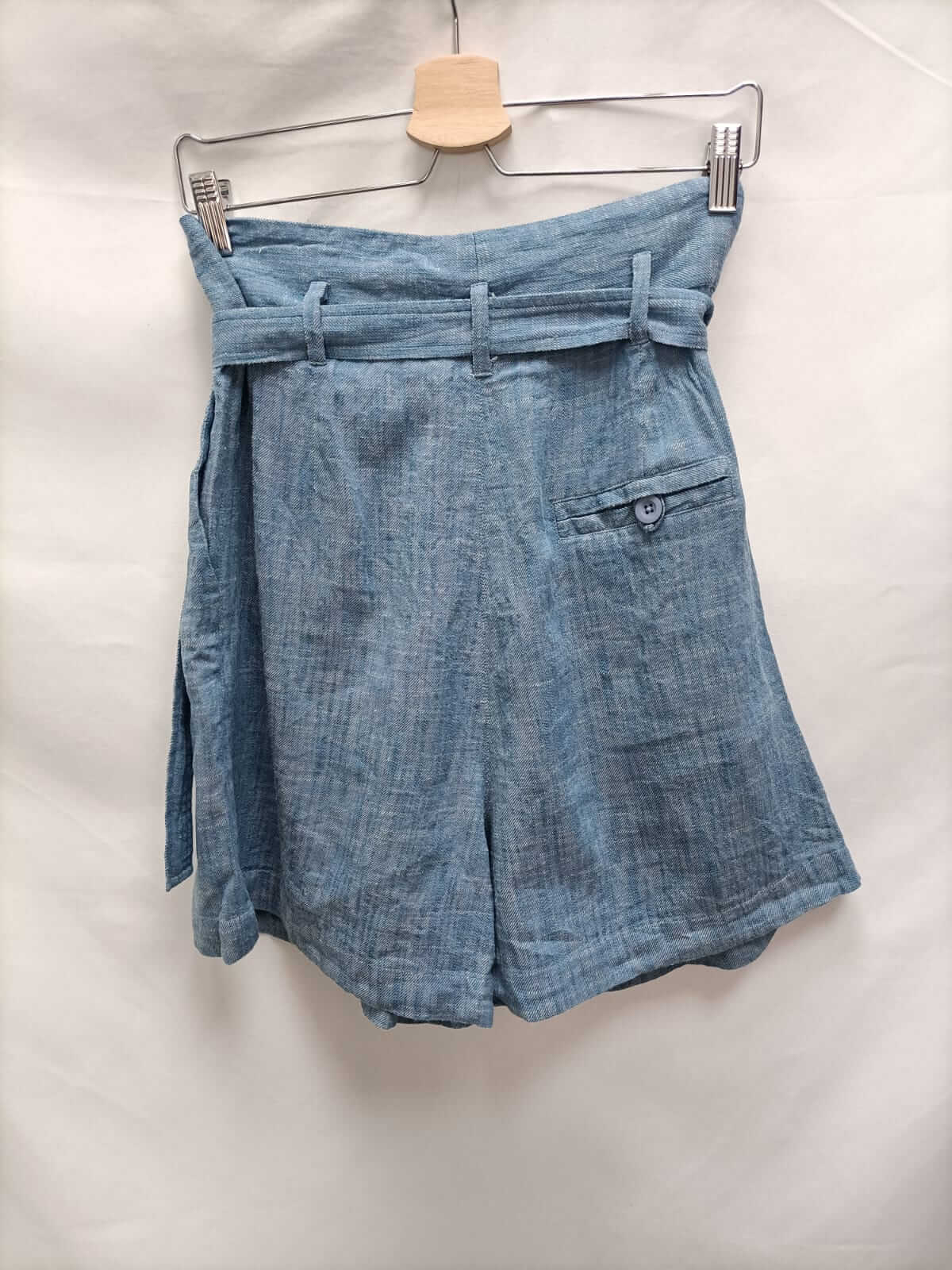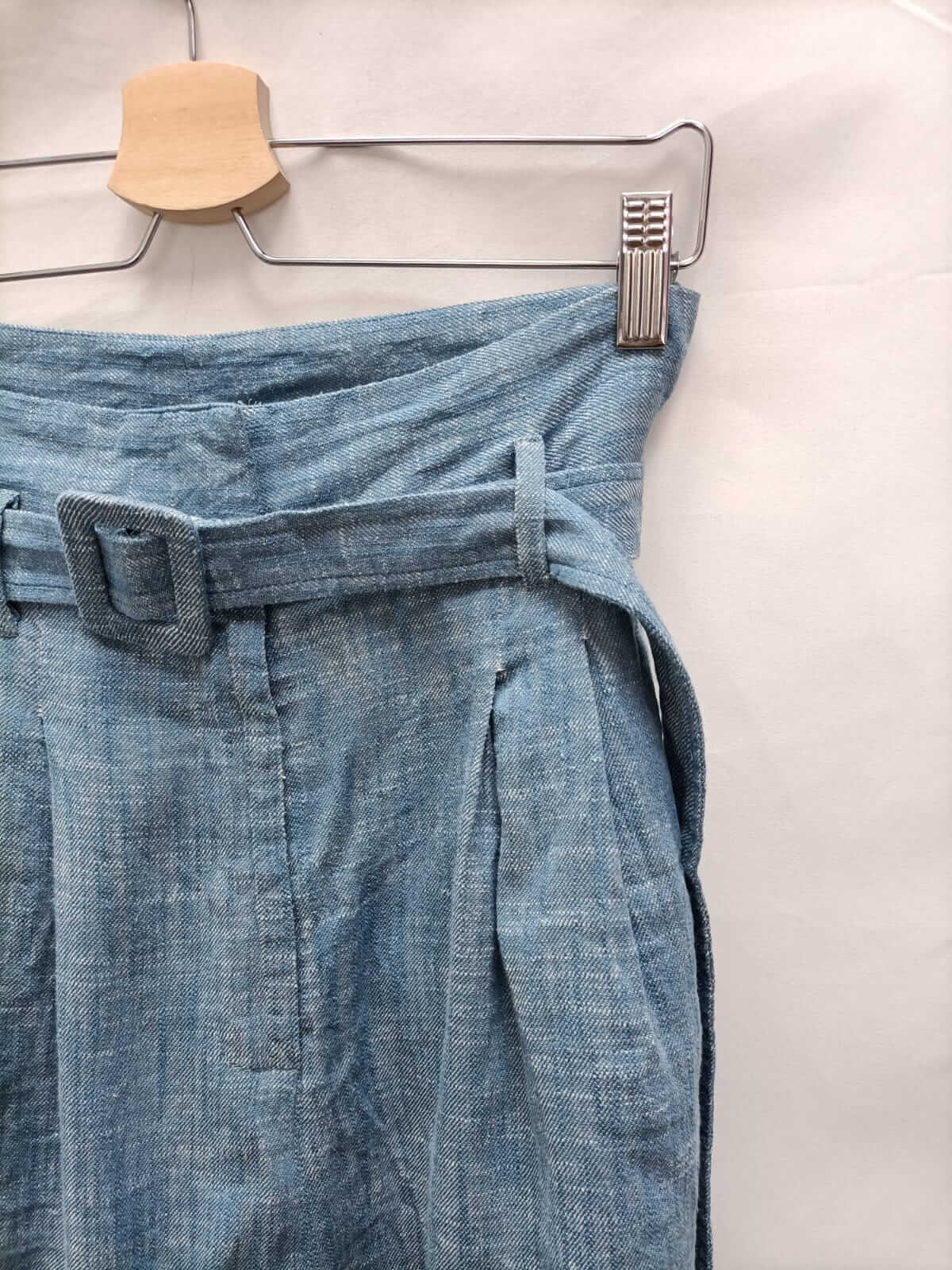 Skaïte. M. Bermuda jaspeada celeste y blancas. No elástica. Cintura 36 cm largo 48 cm