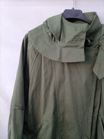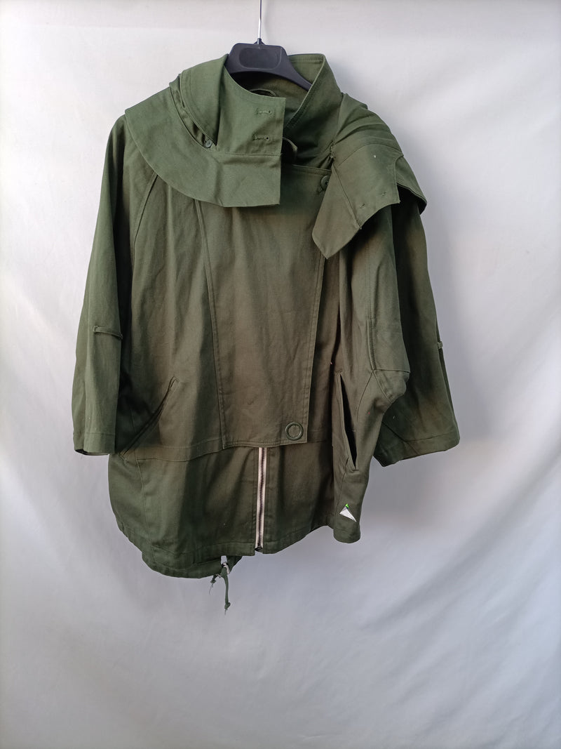 Parka verde caqui fluida con la mangas acampanada 3/4. La capucha es puede quitar y se abrocha con cremallera. Largo 80 cm