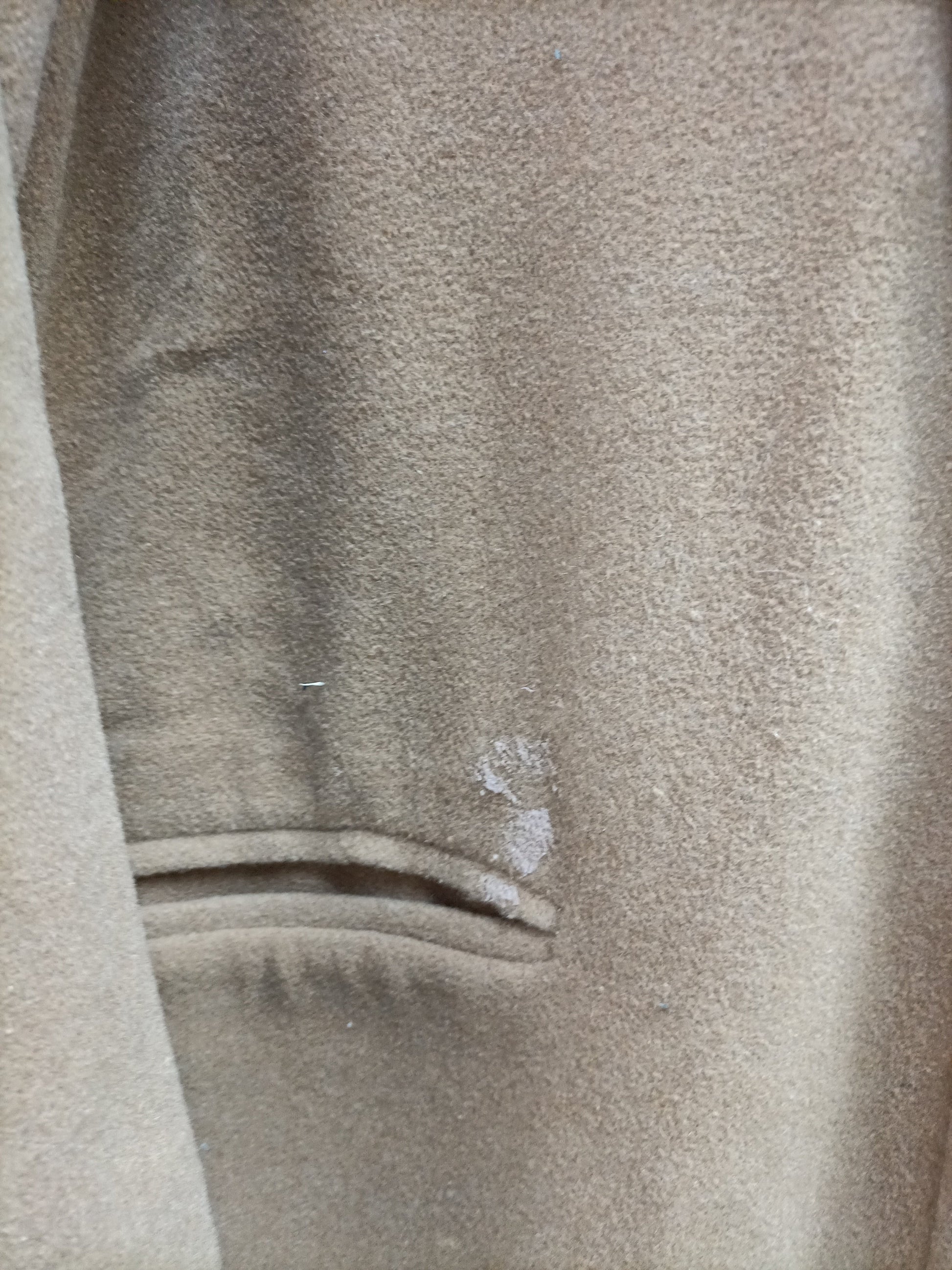 Abrigo de paño camel con detalle de flecos. de sisa a sisa 59 cm largo 91 cm tara:manchita en un bolsillo