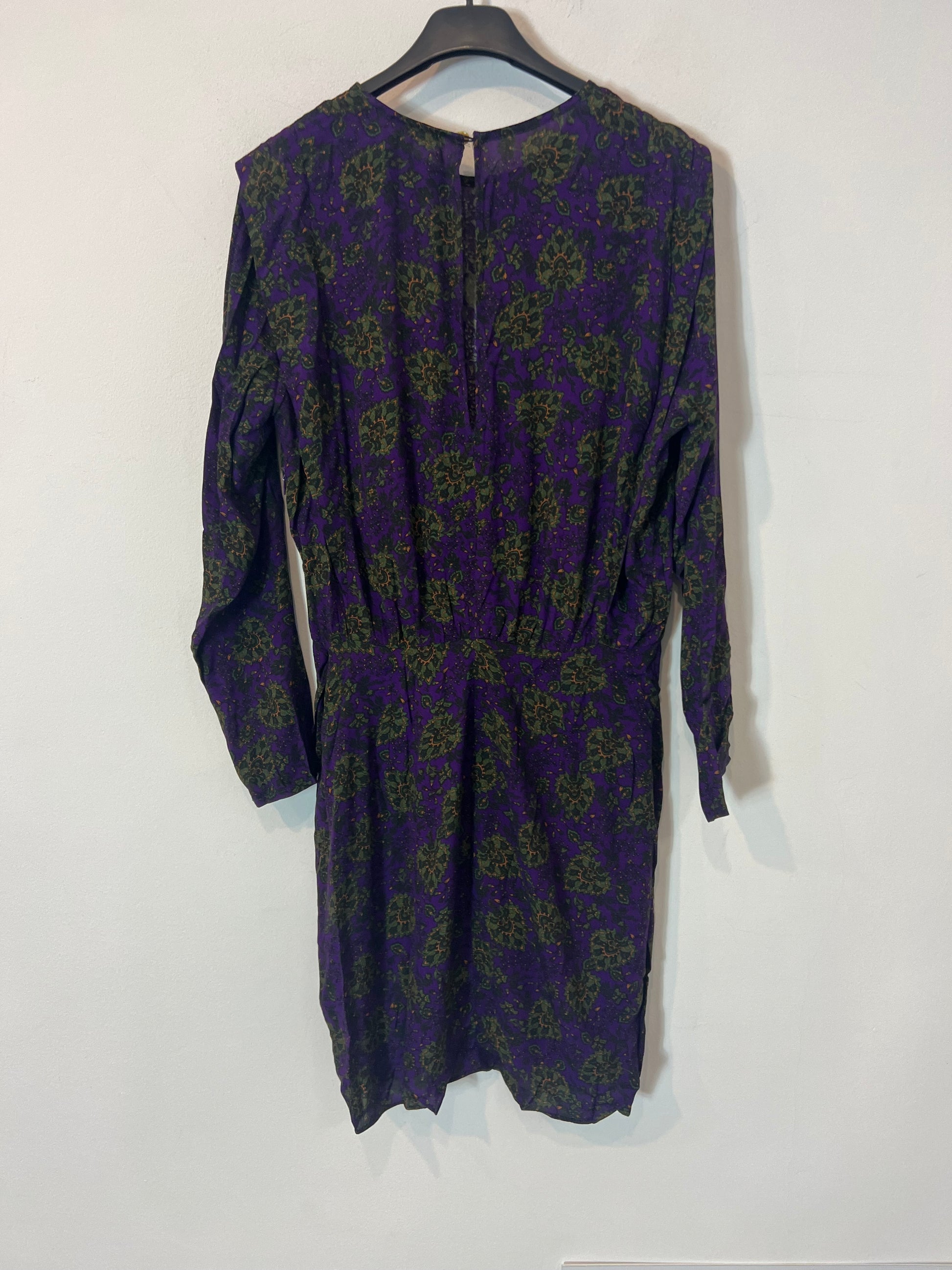Vestido corto morado con estampado en verdes. Destalles en los hombros y falda cruzada . De sisa a siaa 50cm, cintura 36cm ,largo 92cm