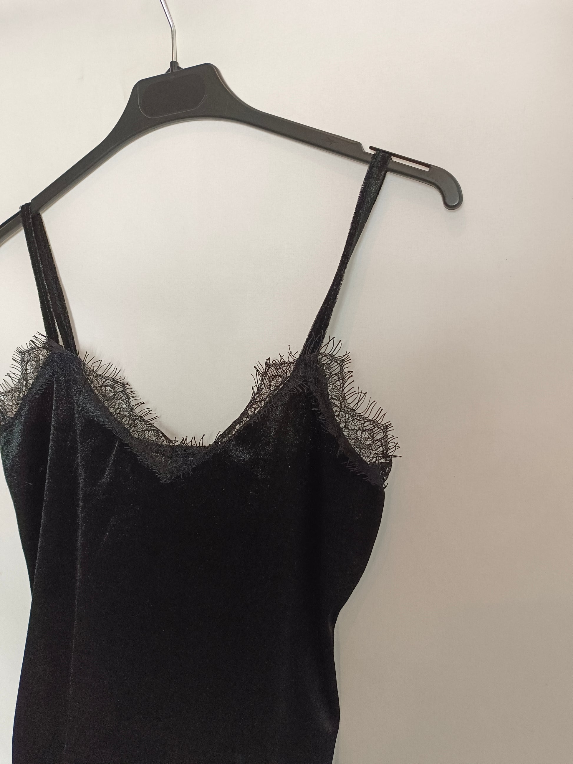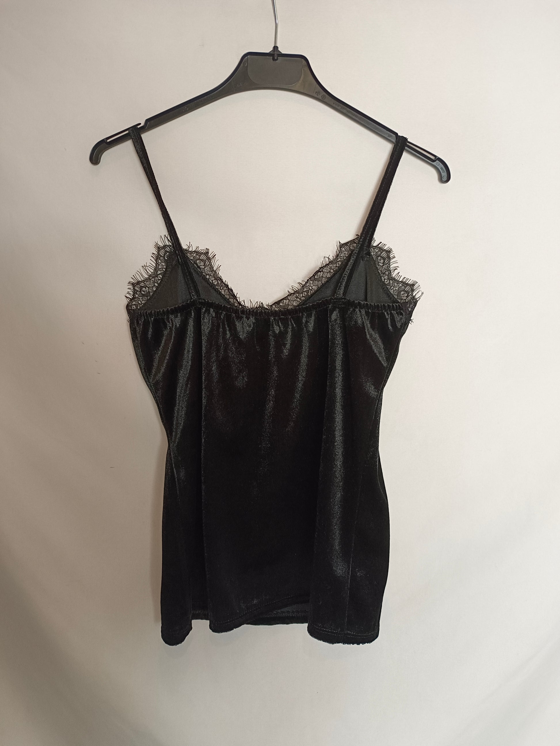 top lencero negro elástico de terciopelo con detalles de encaje.