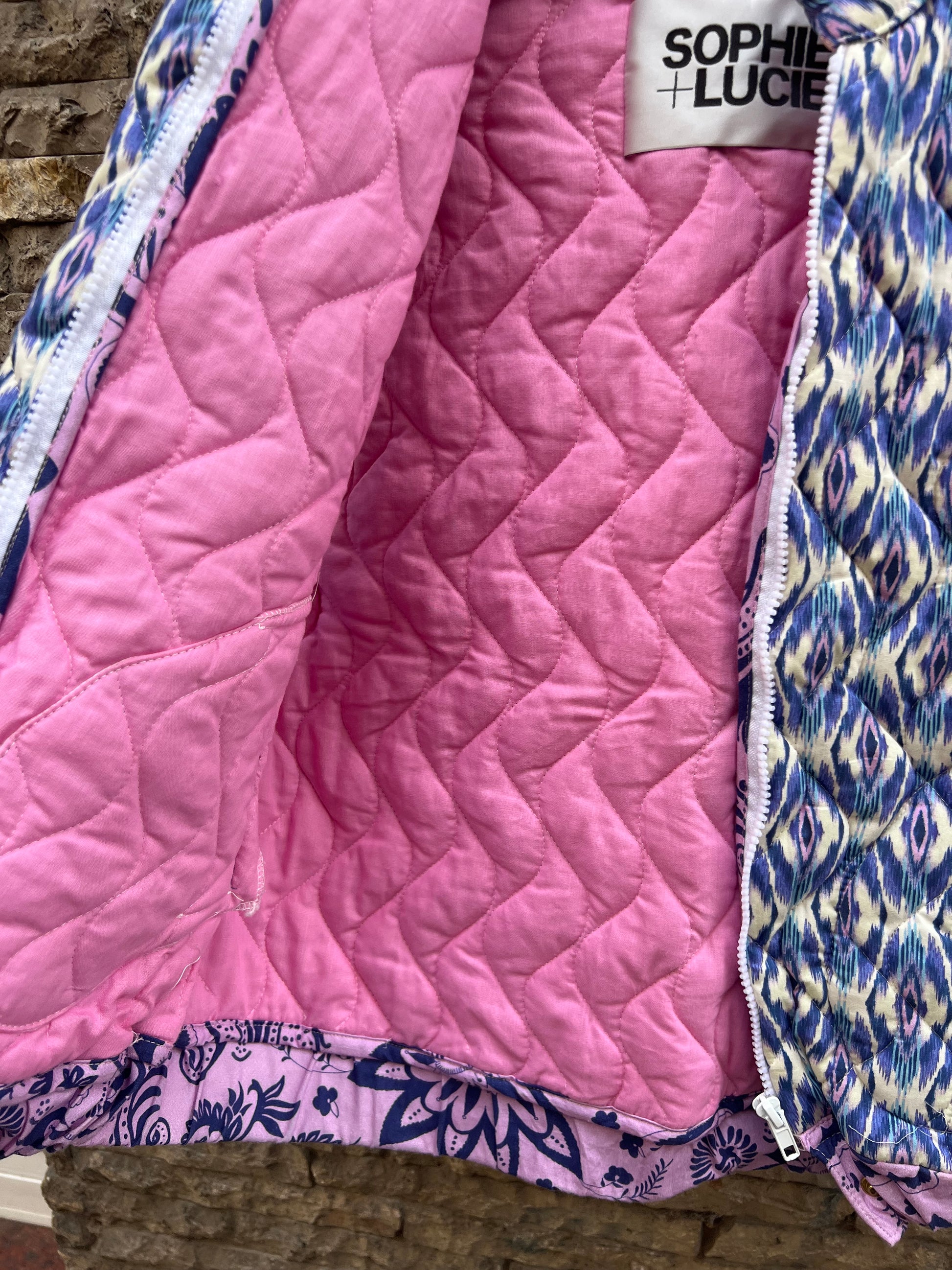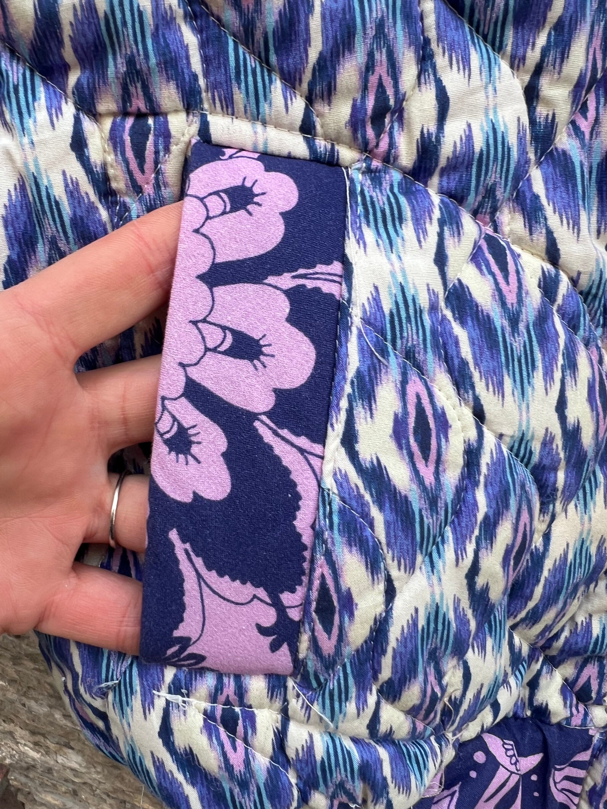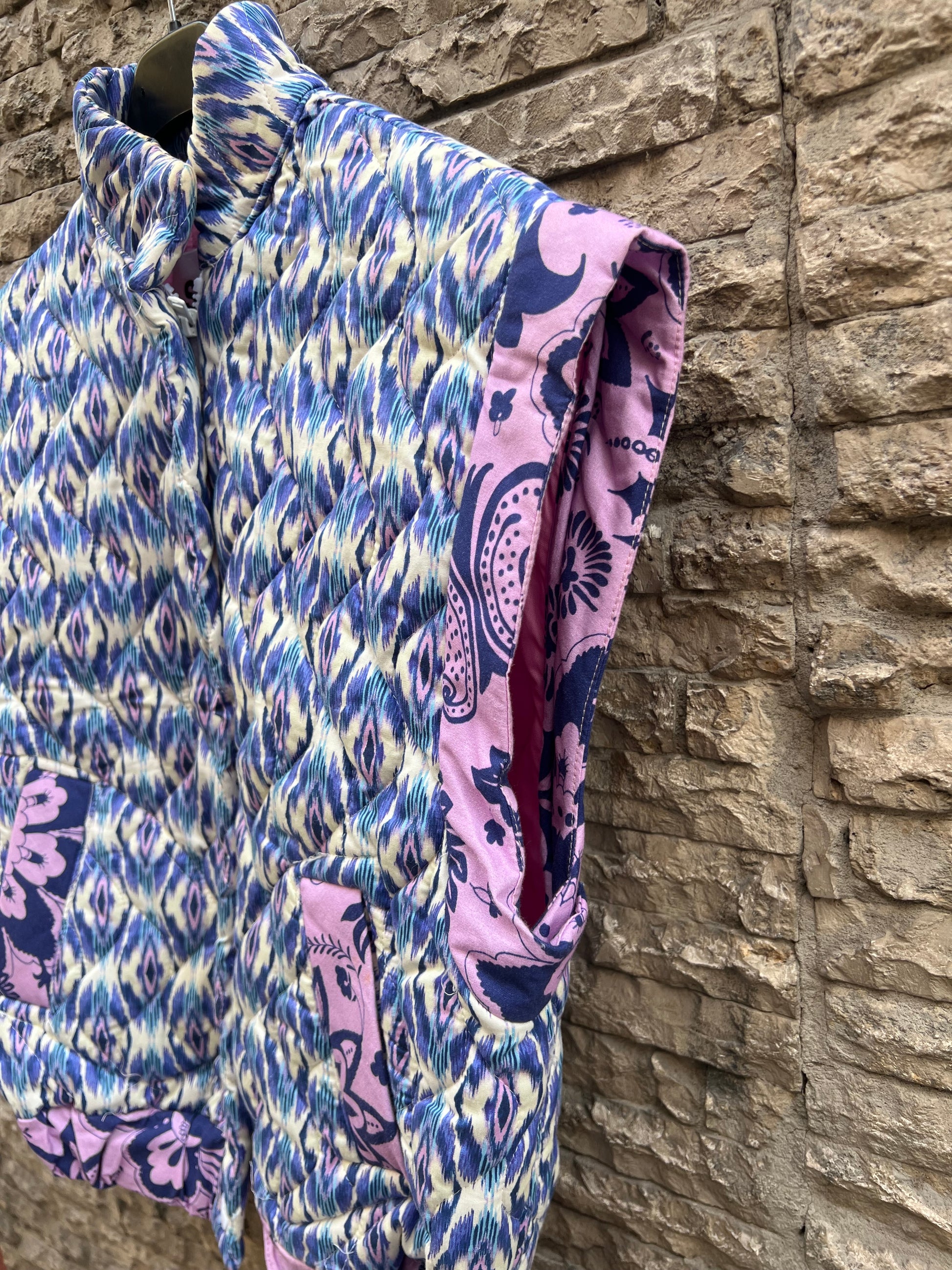 Chaleco estampado morado y rosa estilo reto acolchado. Tara: mini marca cuello maquillaje