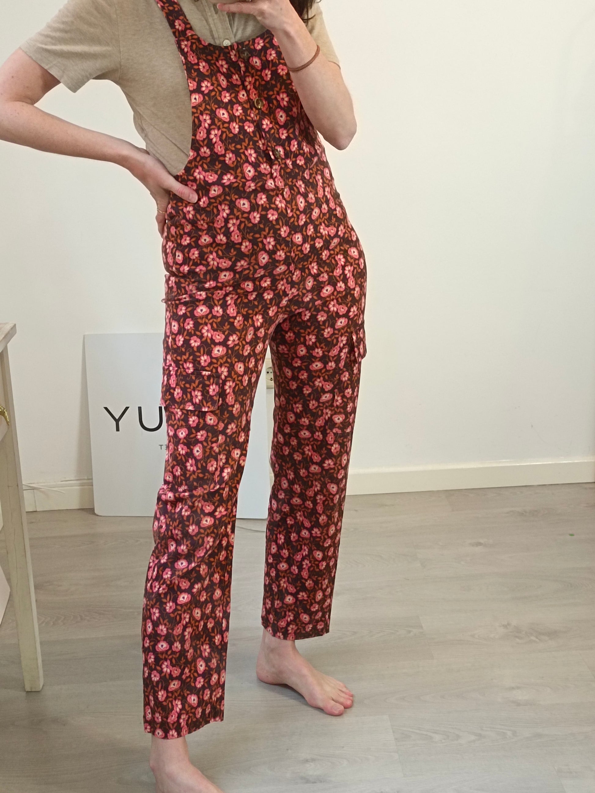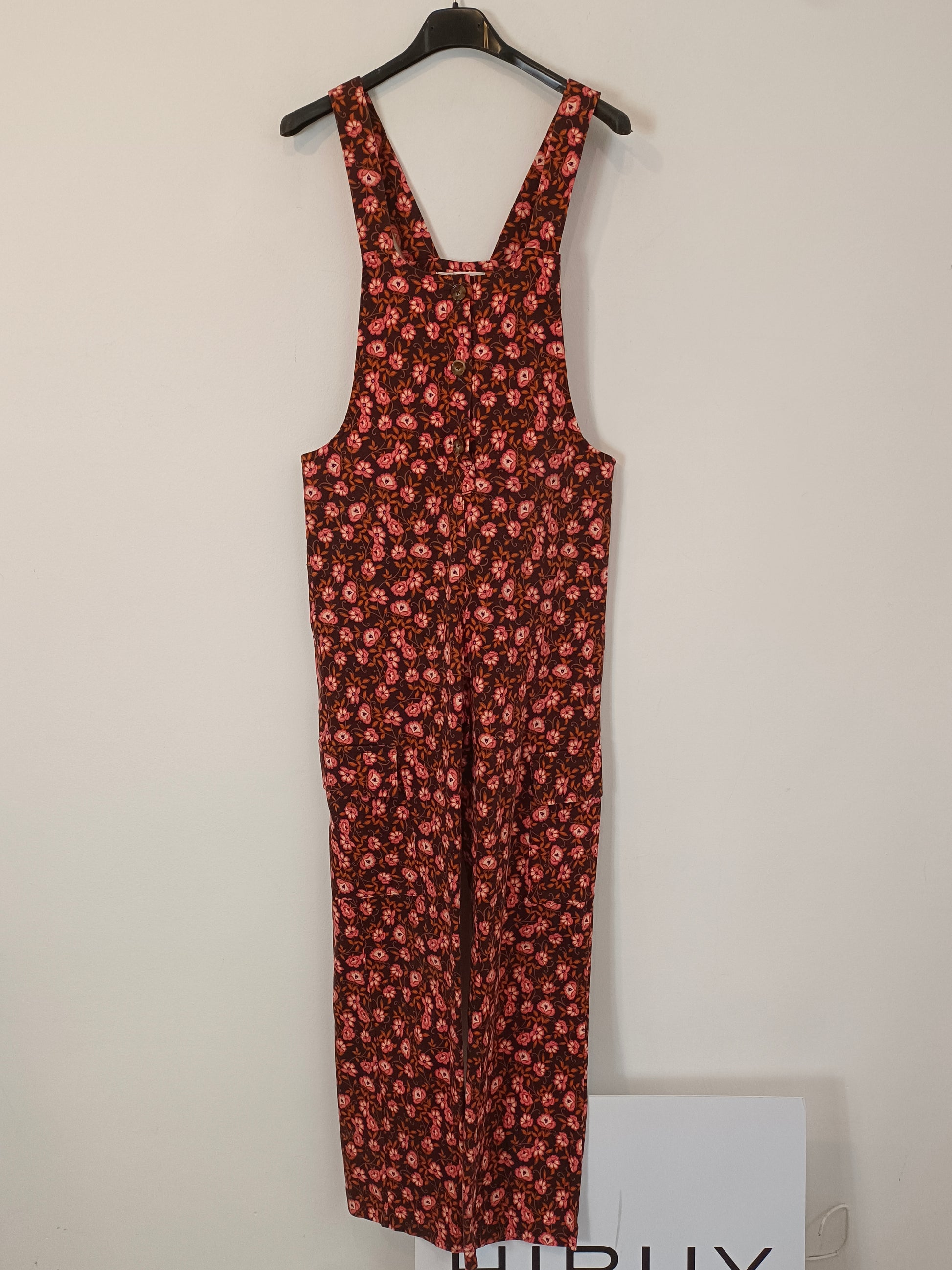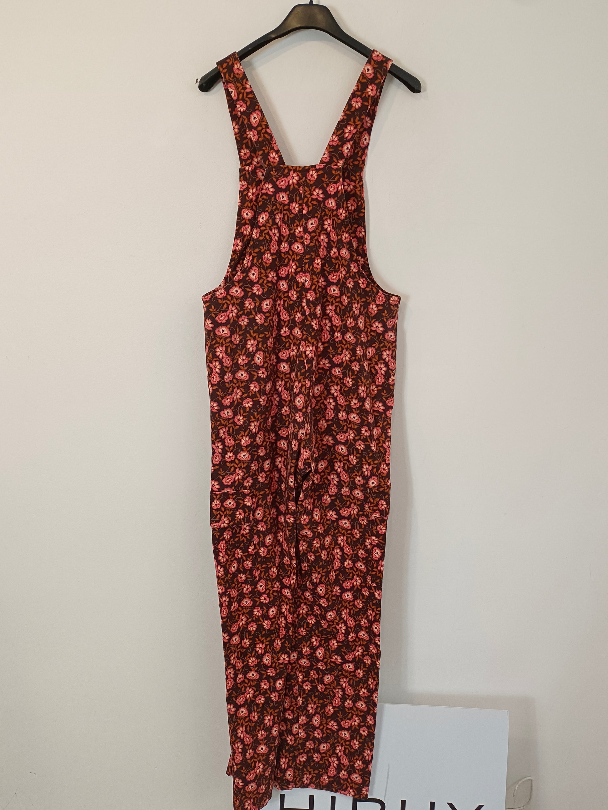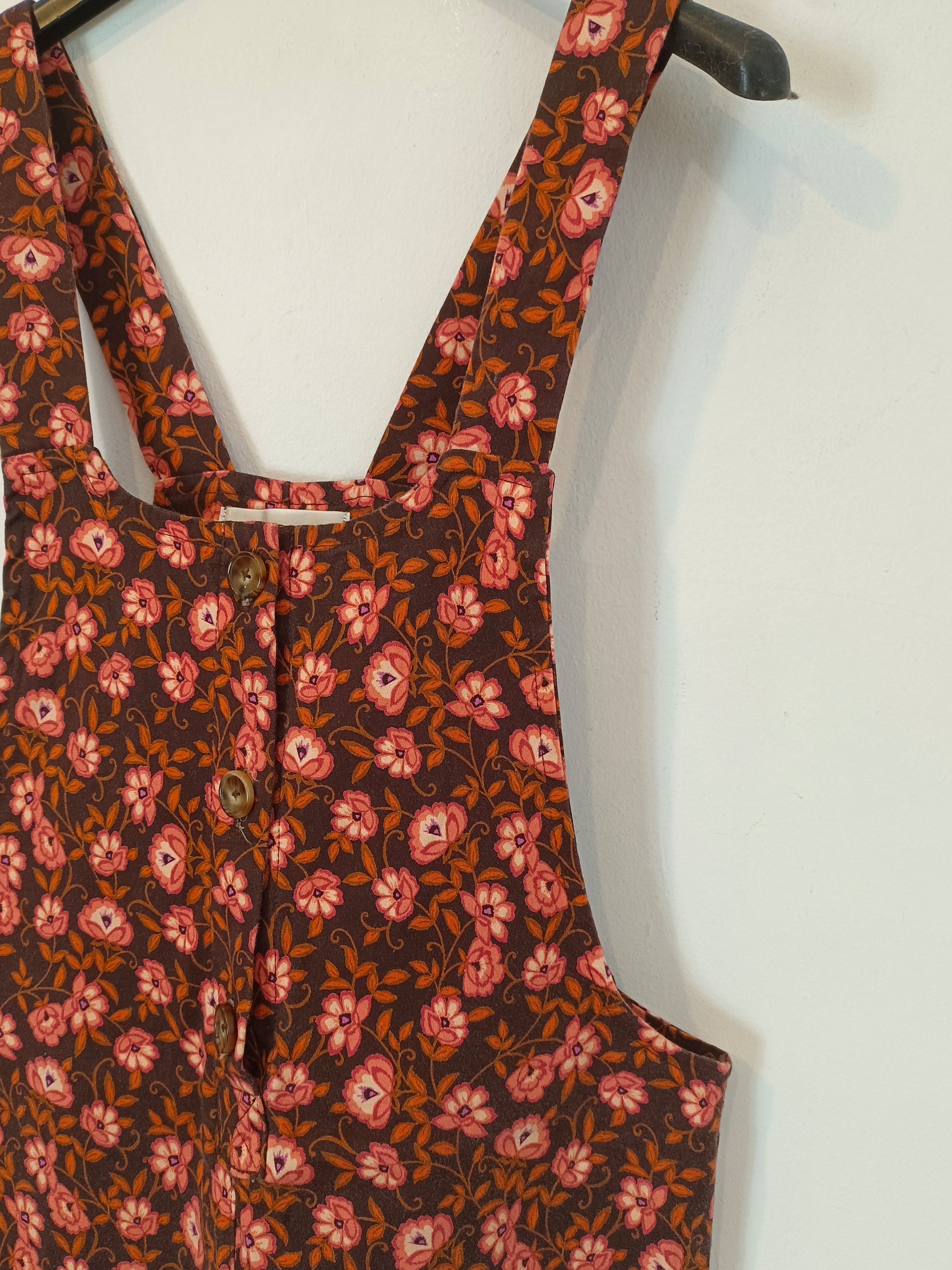 Peto marrón con flores en tonos naranjas. Semielástico. cintura 42 cm largo 141 cm