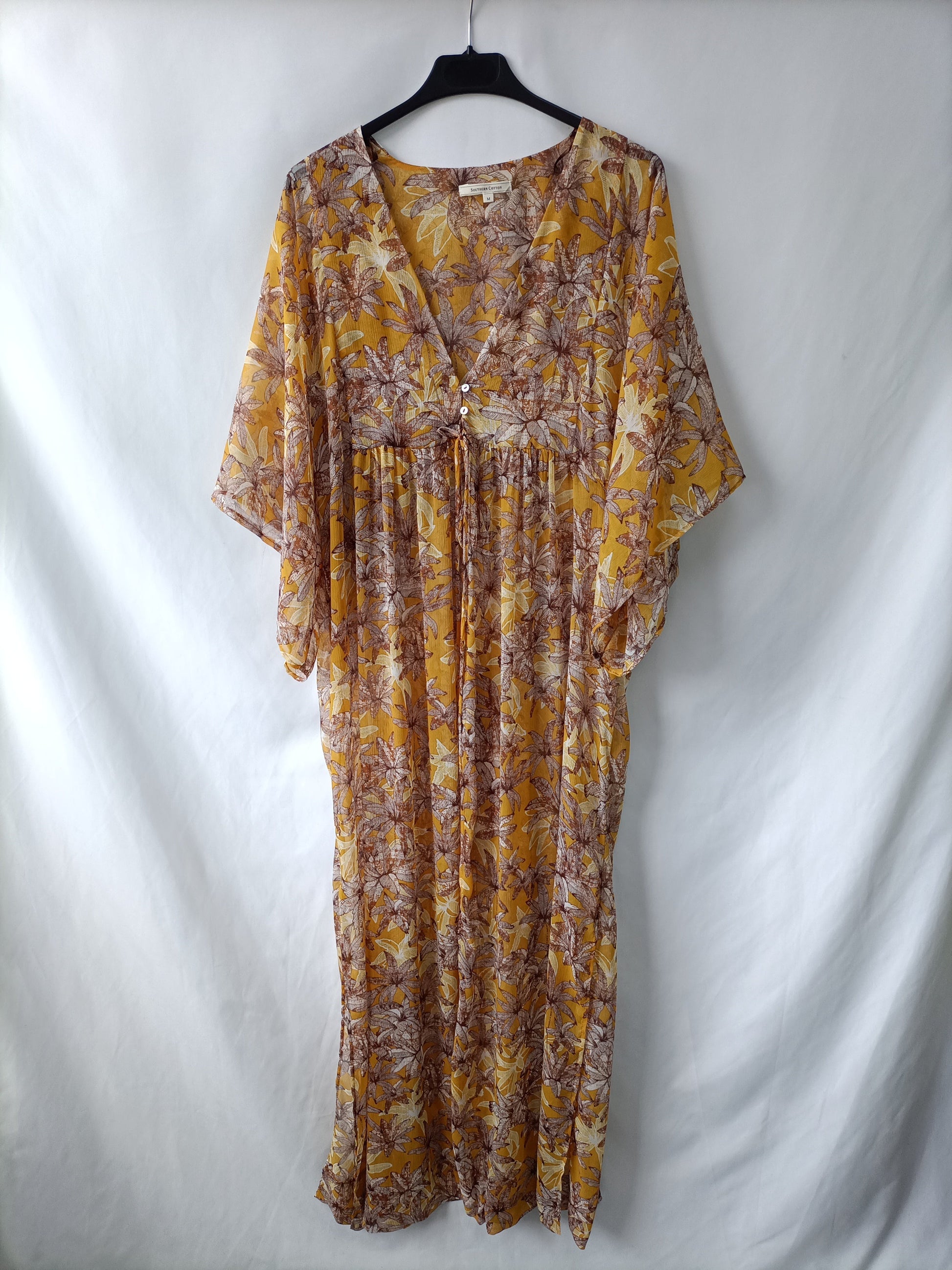 Kimono fluido semitranparente con estampado de Palmeras. Mangas anchas. largo 142 cm