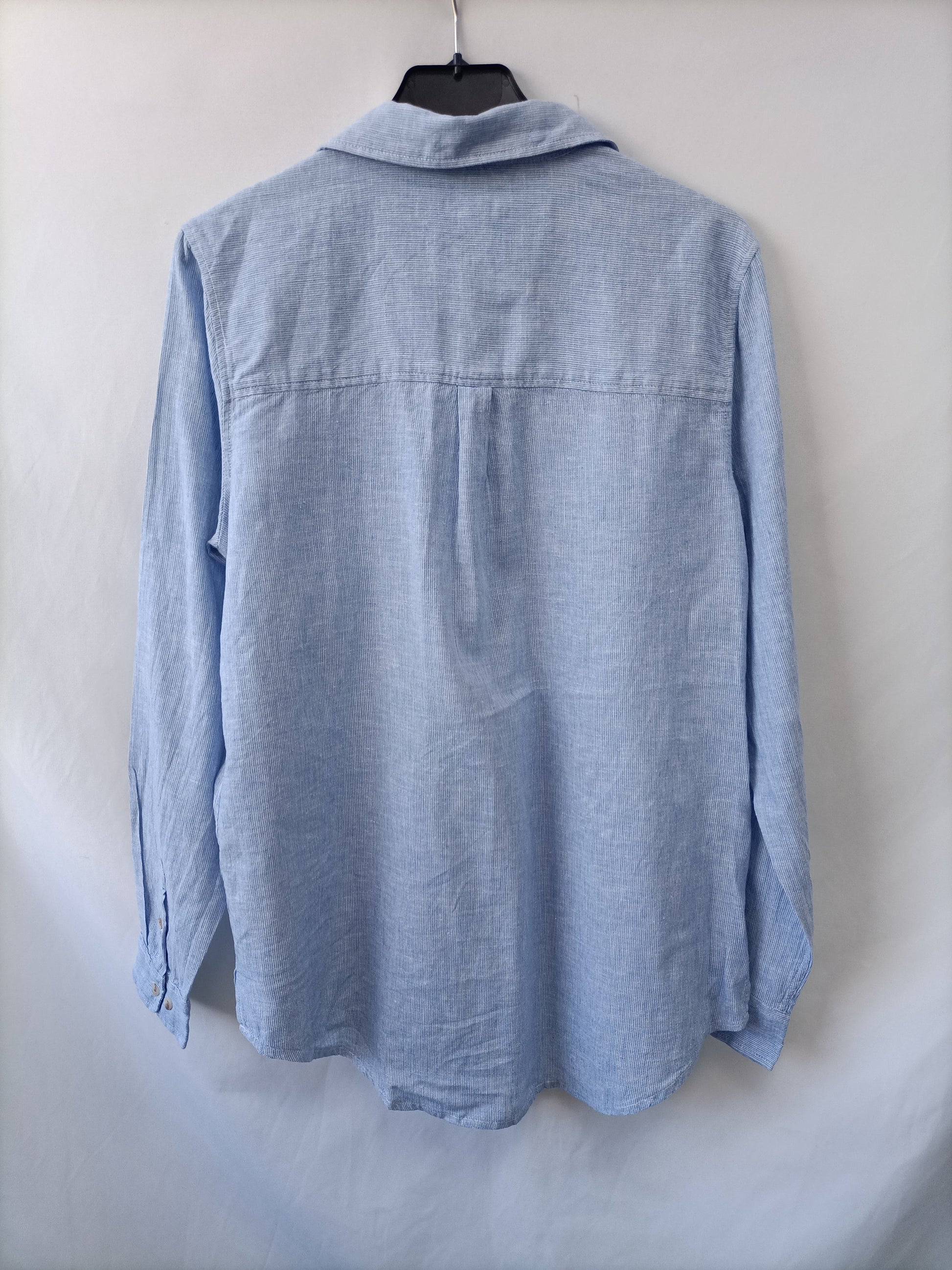 Blusa azul con rayas blancas muy finitas. fluida tejido tipo lino. De sisa a sisa a 52 cm largo 78 cm .