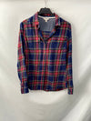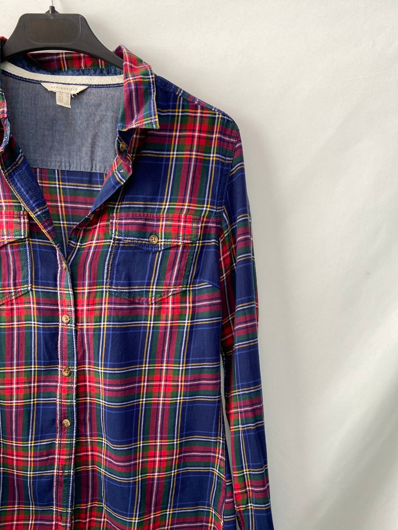 Camisa de cuadros en tonos azules y rojos. No es elástica