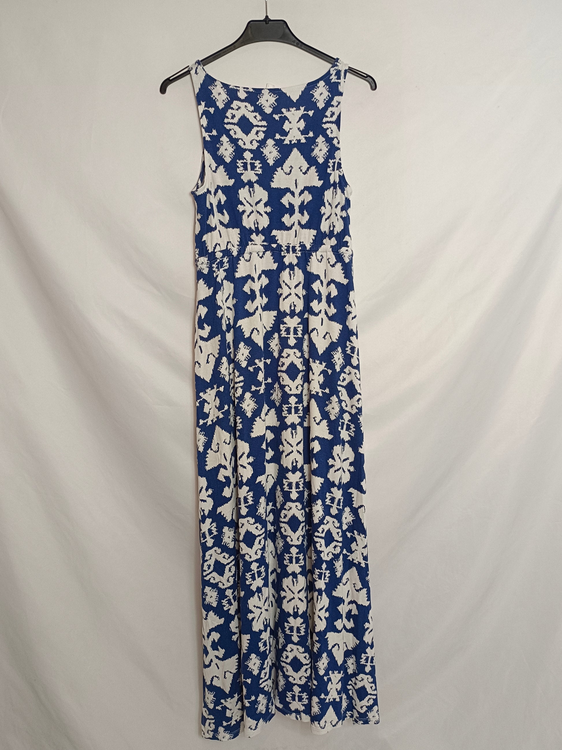 vestido largo estampado azul y blanco de tejido elásticos. Escote estilo triangulo.