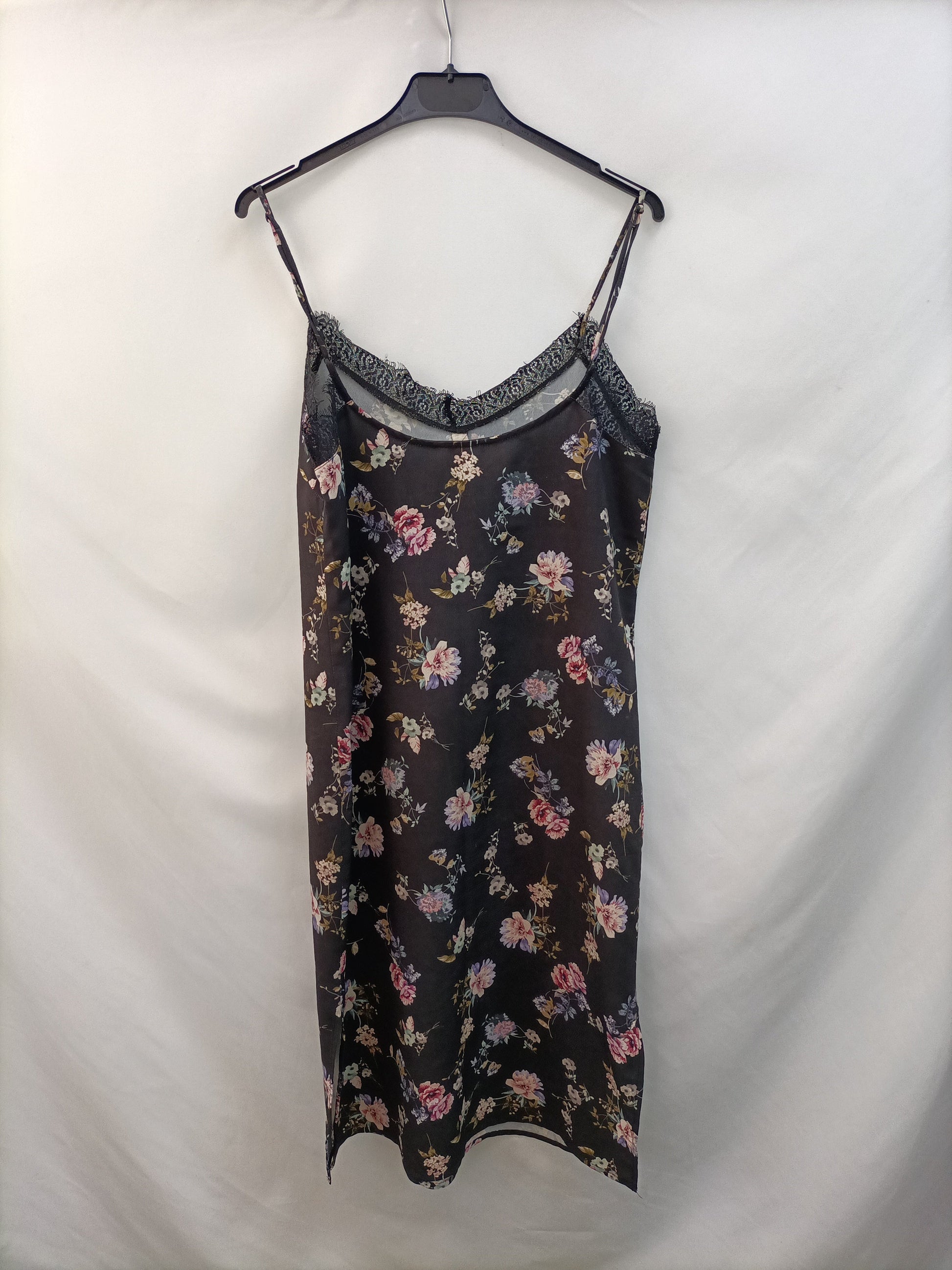 Vestido lencero negro midi con flores. Encaje en el Escote. No elástico. De sisa a sisa 44 cm Largo 109 cm
