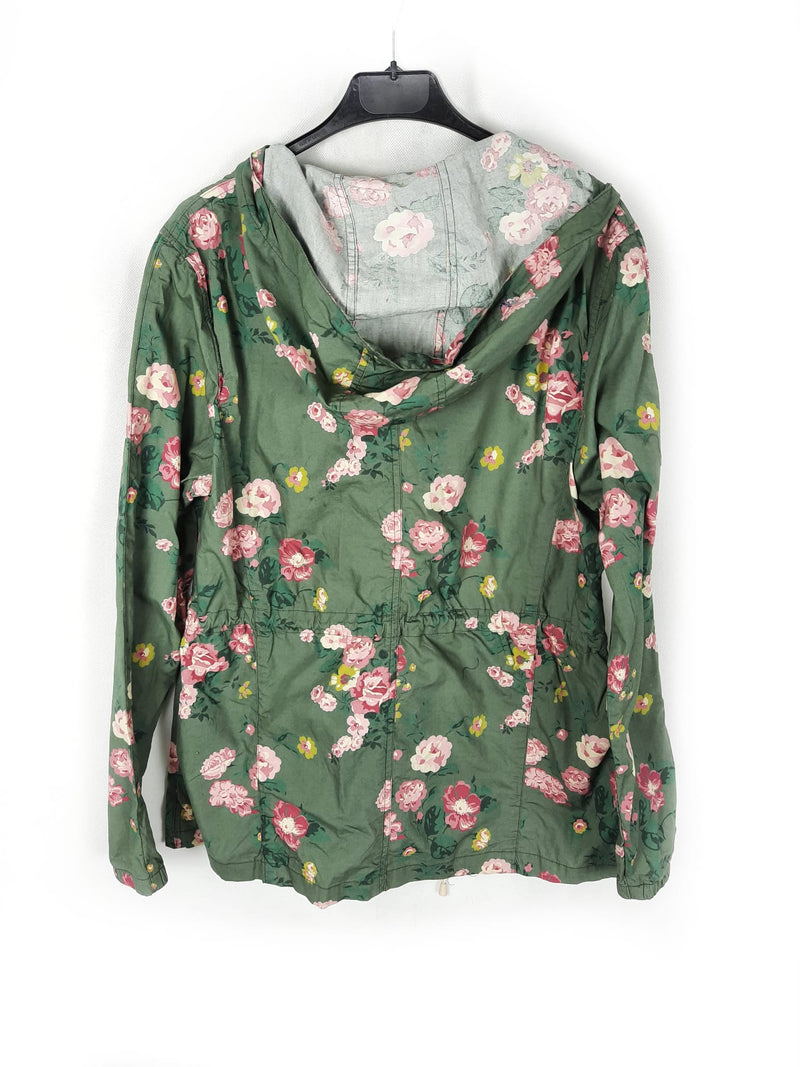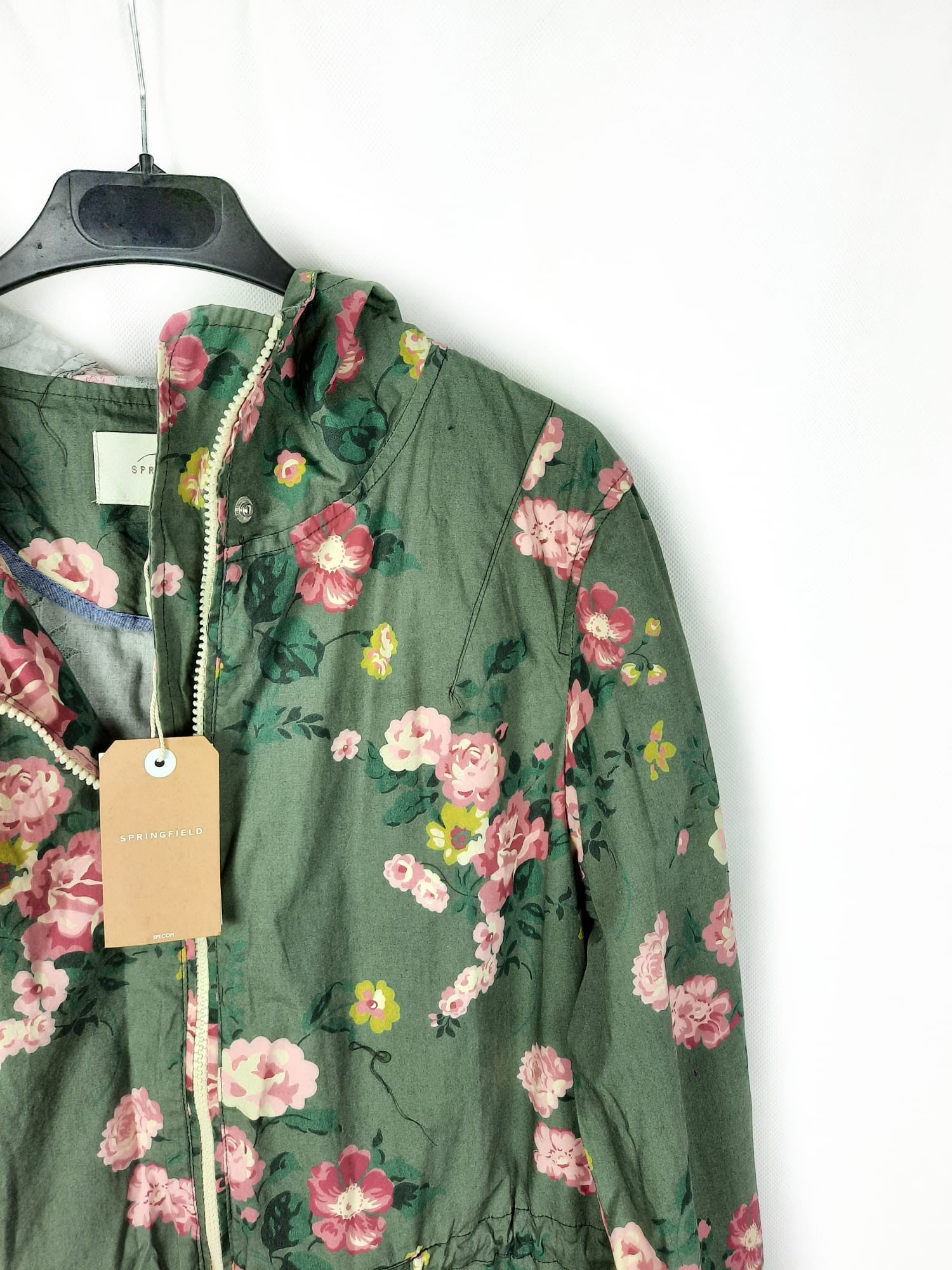 NUEVA CON ETIQUETA. Parka verde con flores, se abrocha con cremallera, es finita. Largo 74 cm