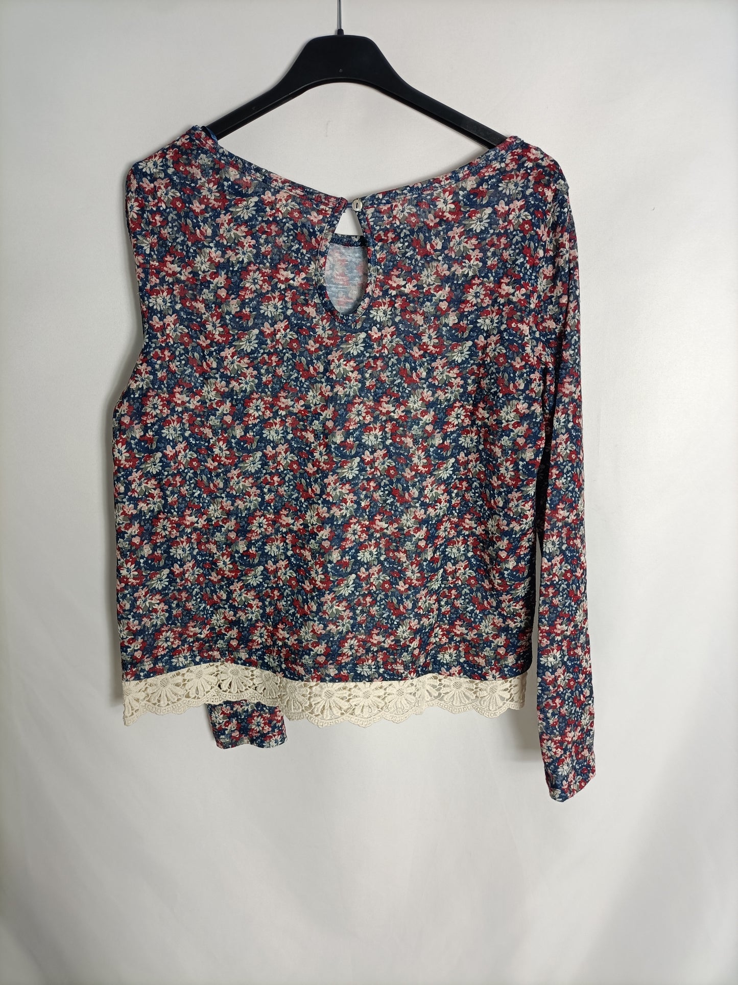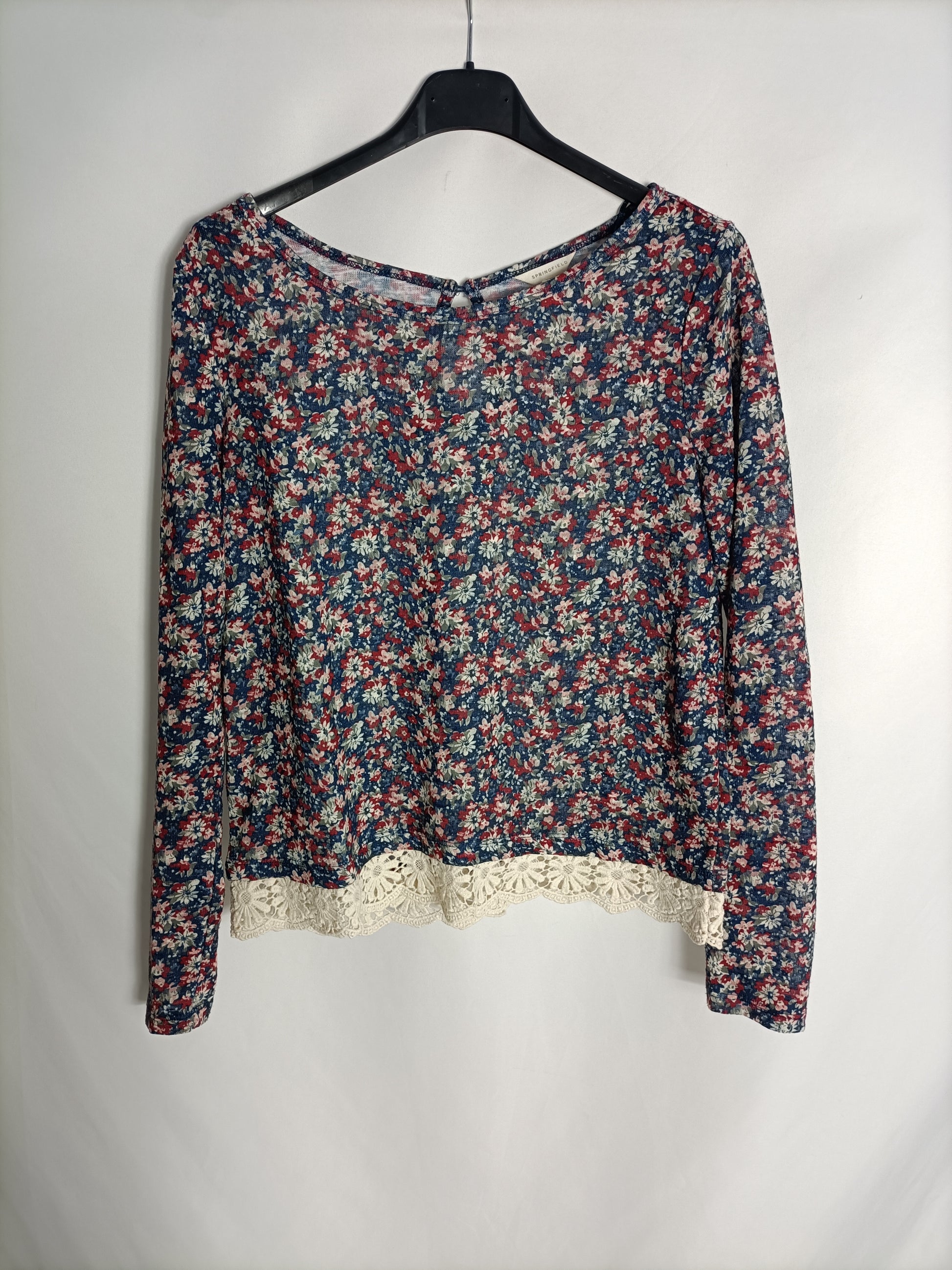camiseta azul de flores con detalle de encaje en la parte de abajo