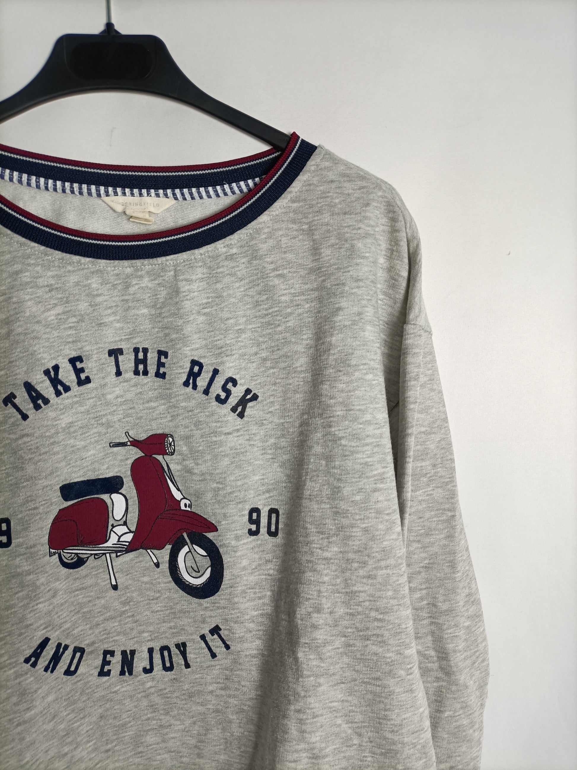 Sudadera gris con dibujo de moto y detalle de blusa en la parte de abajo
