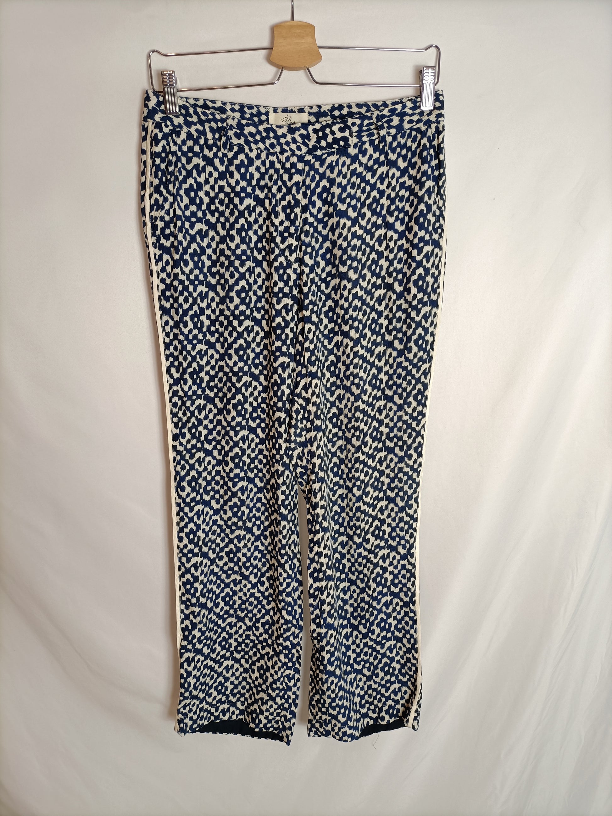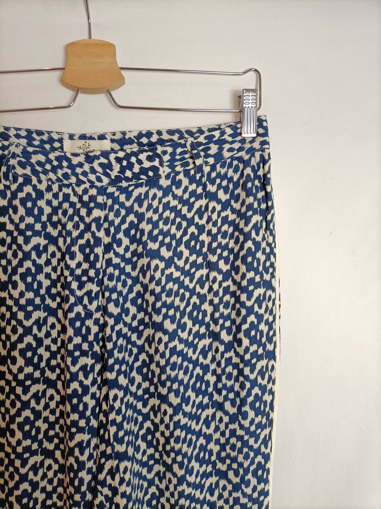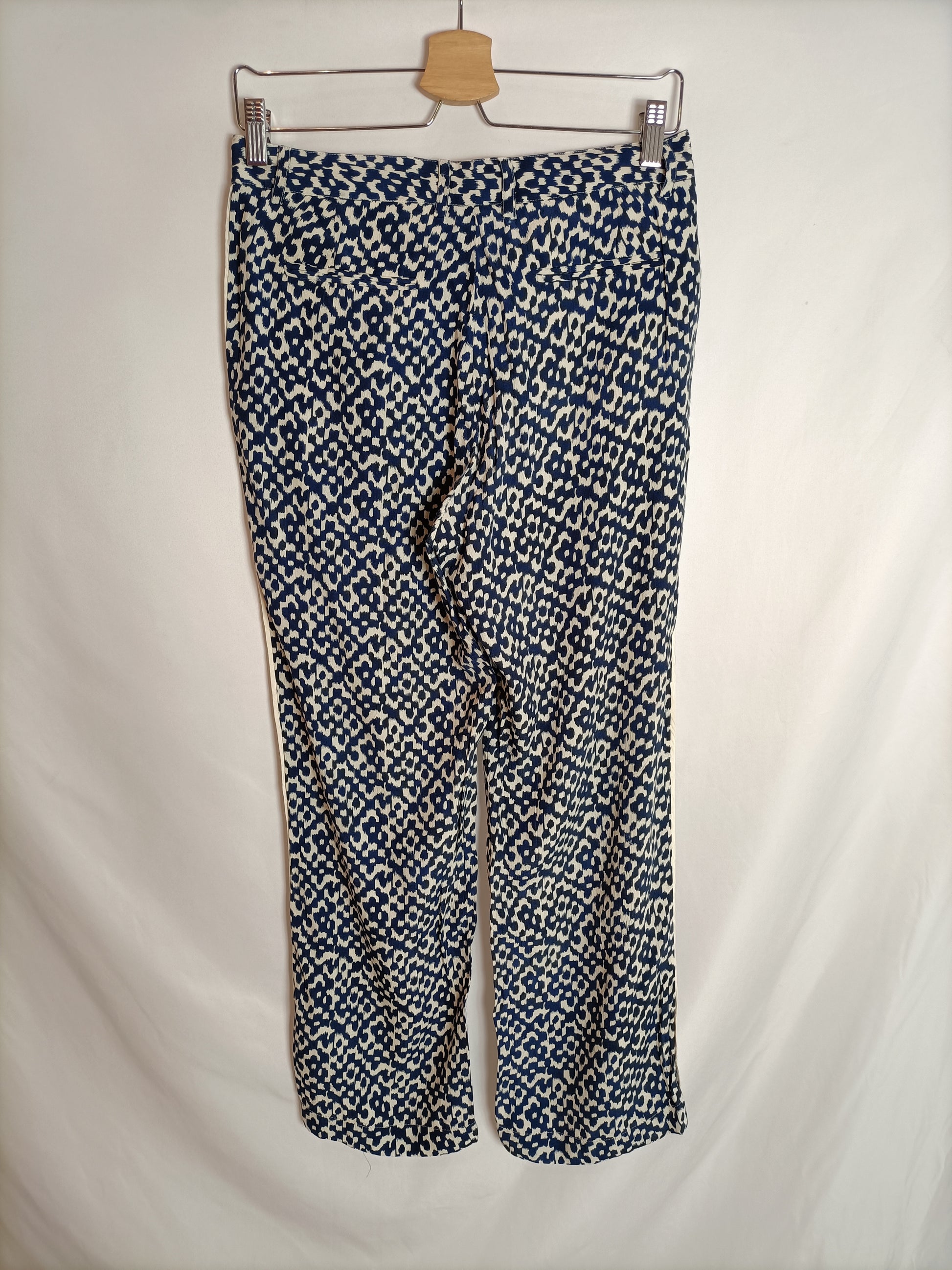 Pantalón fluido estampado efecto print azul y blanco. cintura 36 cm