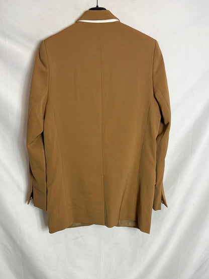 blazer camel fluida de tejido con textura. Hombros 38cm, largo 74cm, de sisa a sisa 48cm