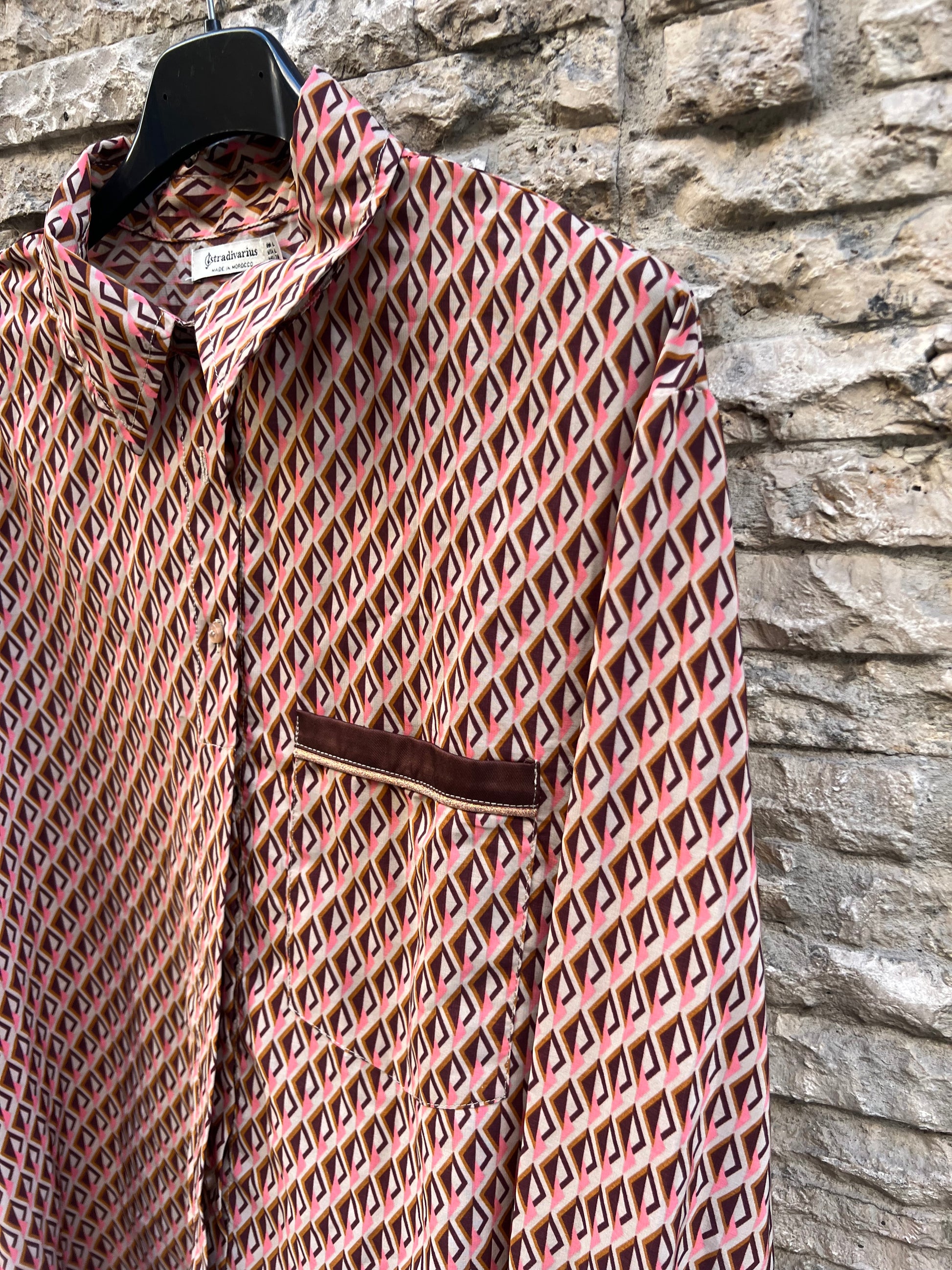 Blusa fluida estampado retro. De sisa a sisa 55 cm ,largo 62 cm . Tonos rosa y marrones