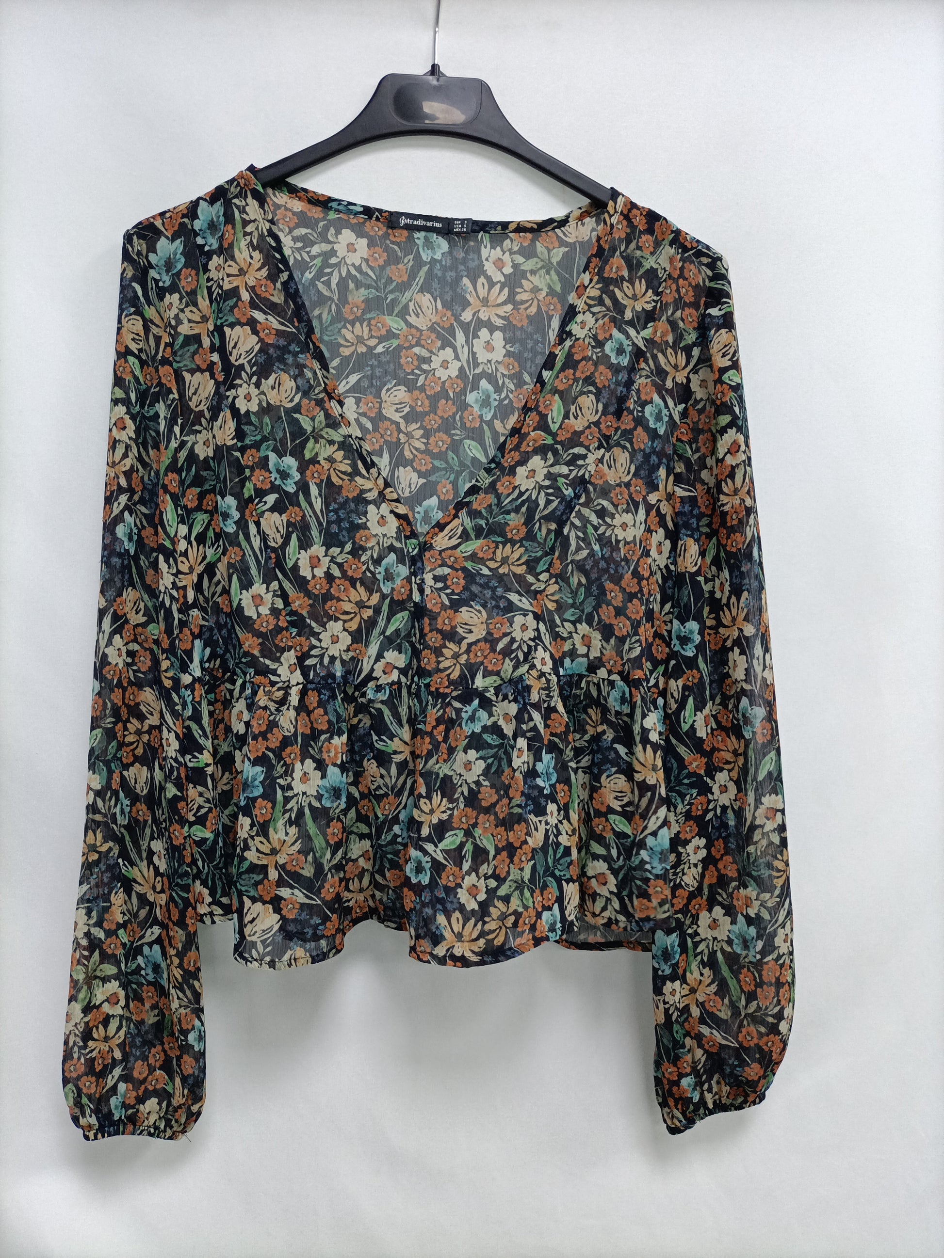 blusa fluida negra de flores semitransparente. largo 72 cm