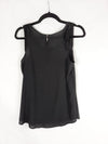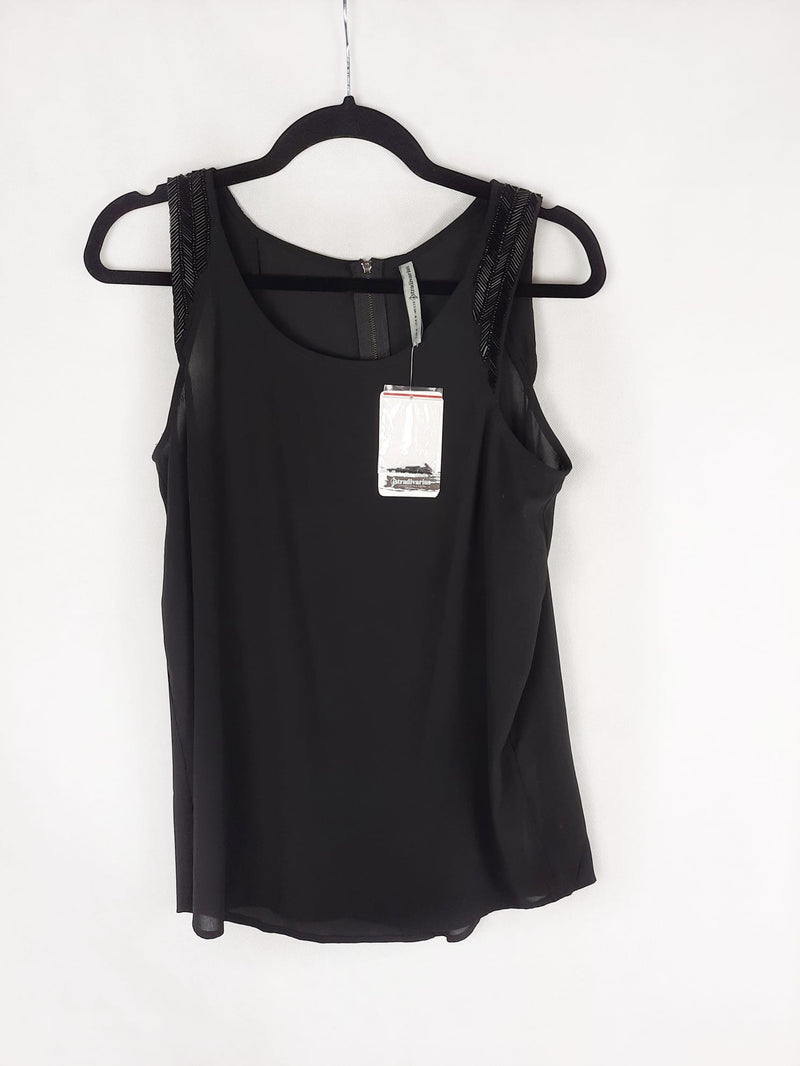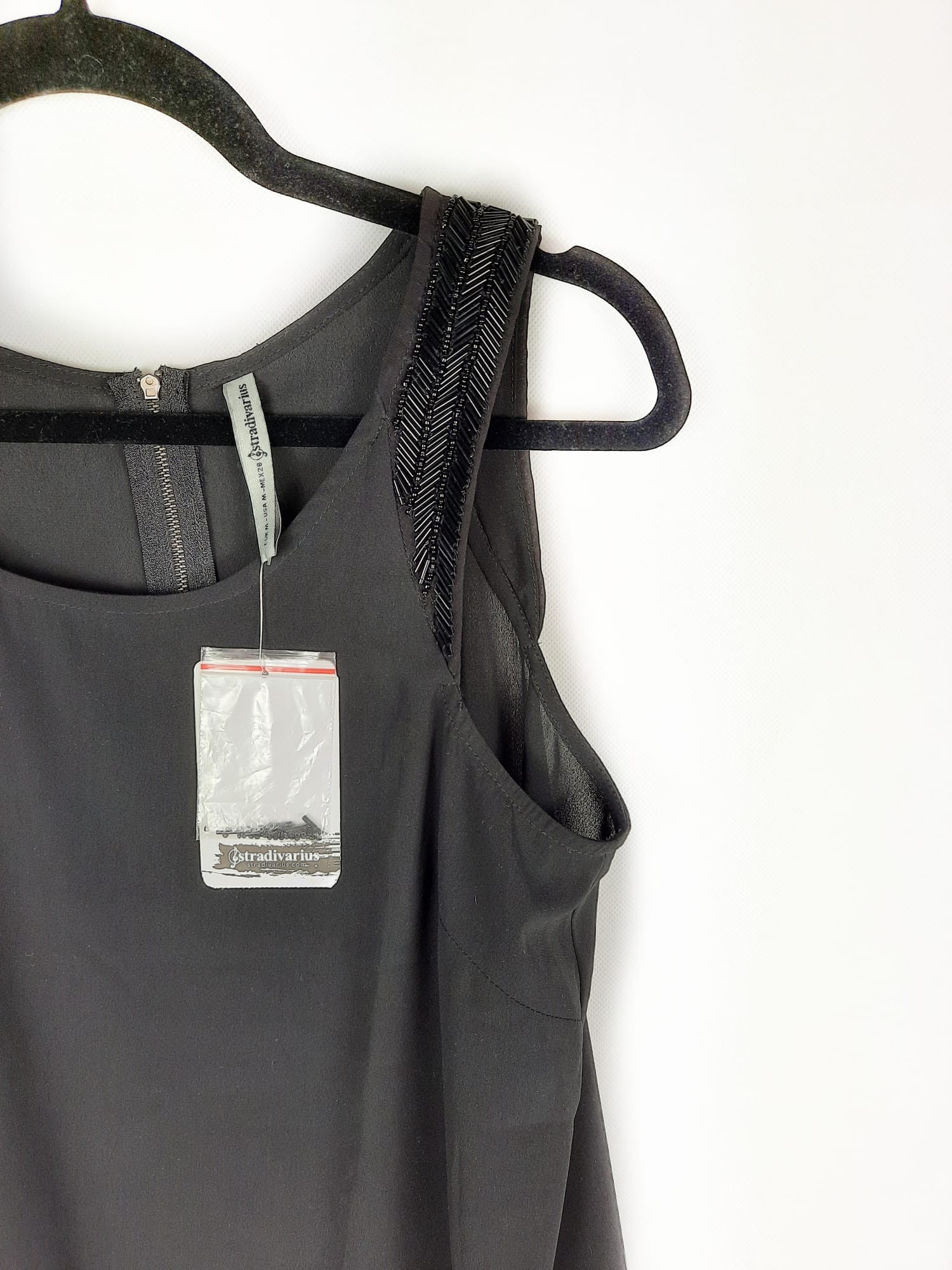 Blusa negra con detalles de pedrería en los hombros. Tejido no elástico y semitransparente. Cremallera corta en la espalda. De sisa a sisa 46 cm, largo 68 cm
