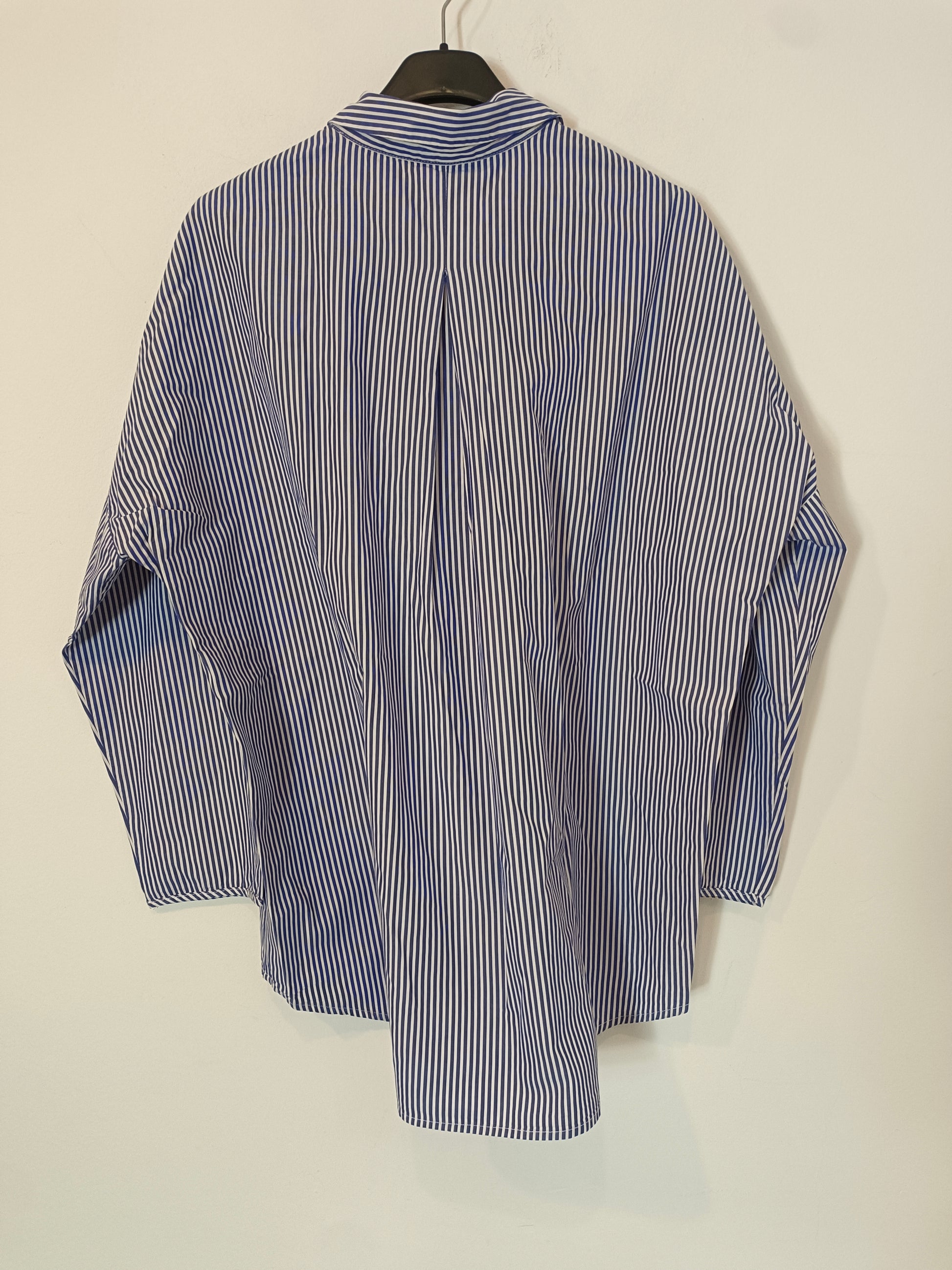 camisa estilo oversized de rayas azul y blanca con flores bordadas.