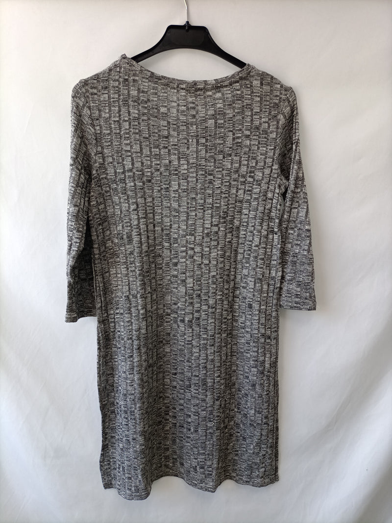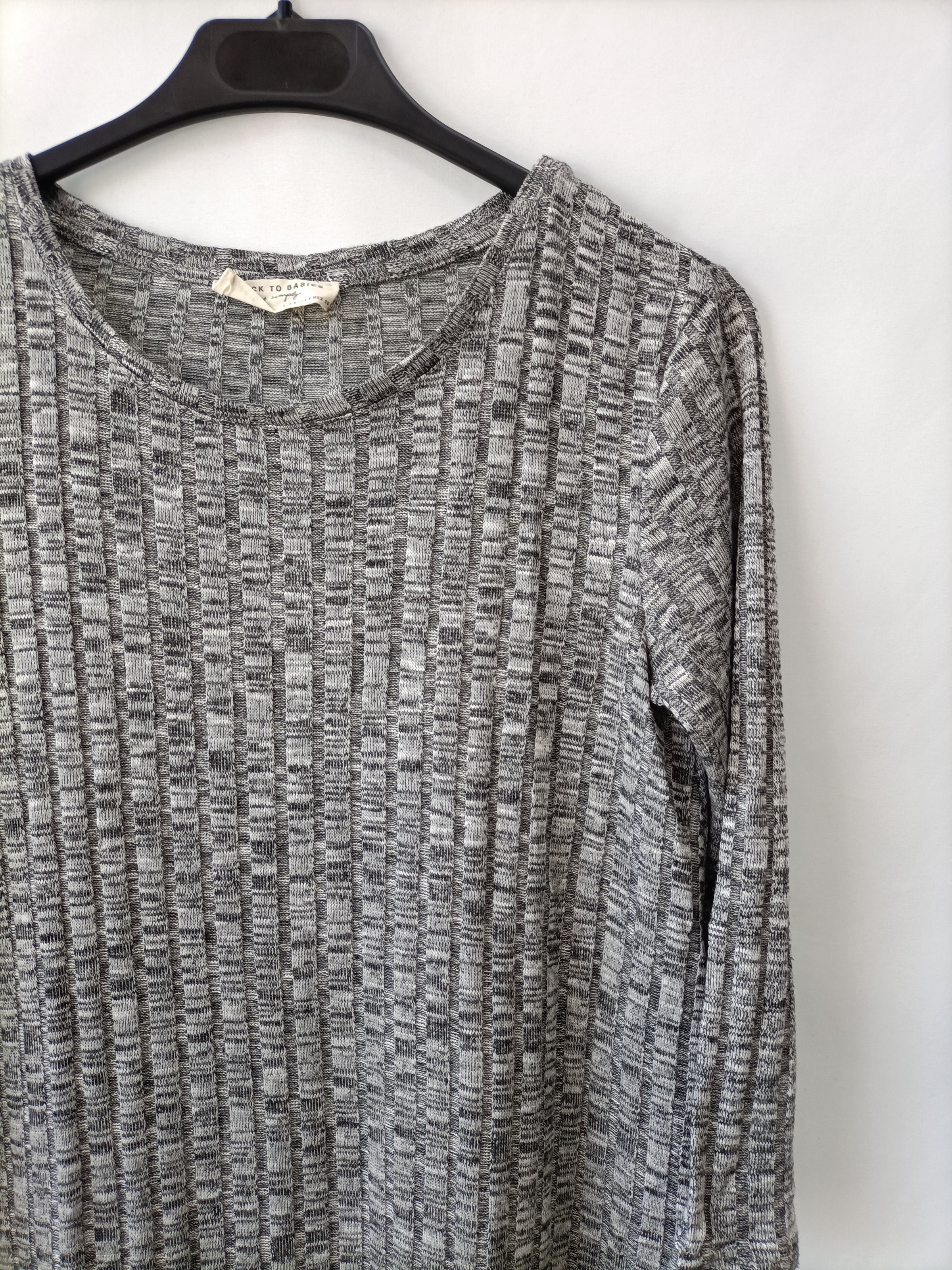 Camiseta larga gris jaspeada de canalé. Manga 3/4. Elástica. Largo 81 cm